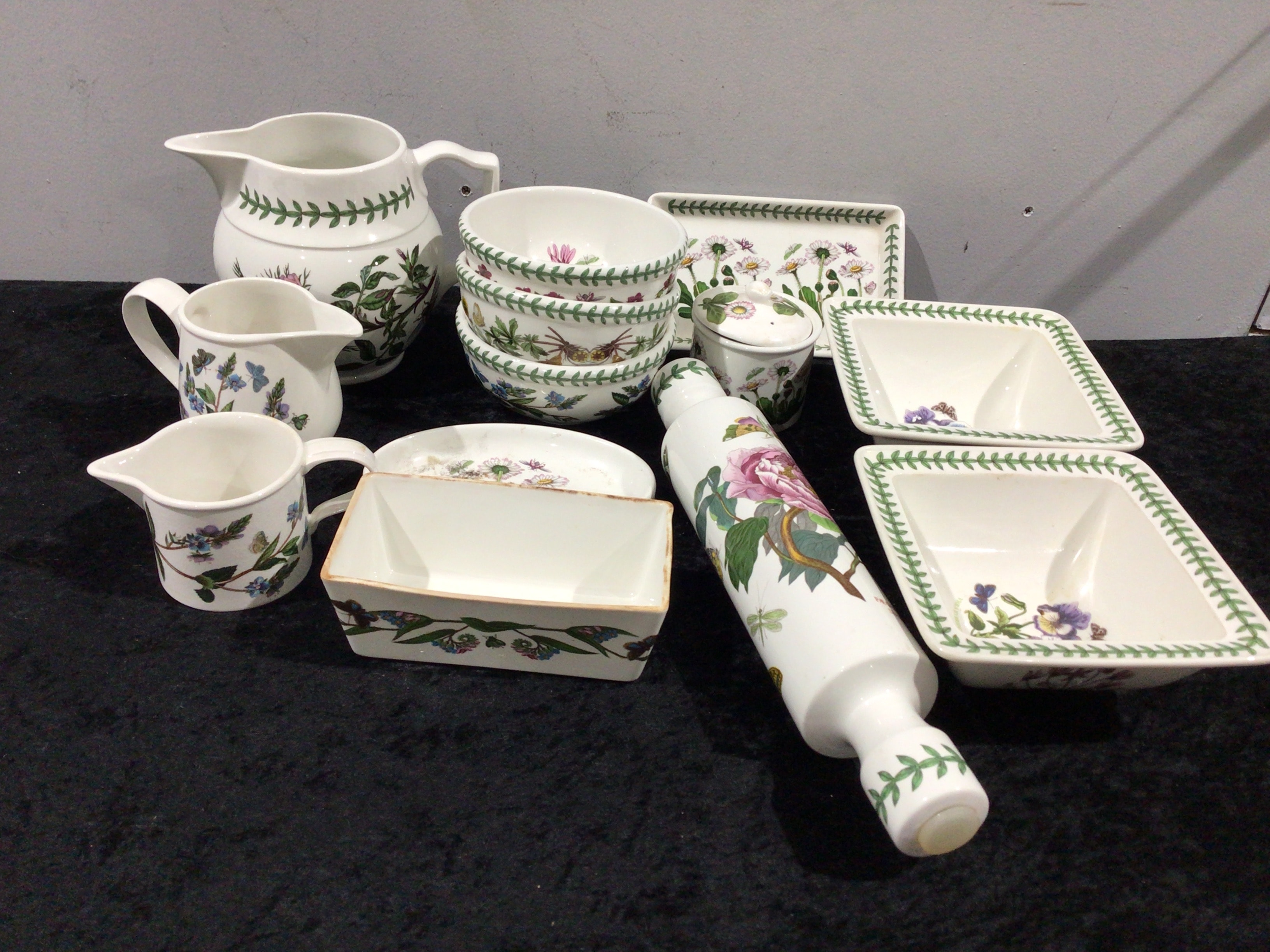 A collection of Portmeirion ‘Botanic Garden’ pattern ceramic tableware and kitchenware. Comprising approximately twelve pieces of white glazed ceramic, each decorated with a distinctive green laurel-leaf border and various central botanical illustrations of plants, sometimes including insects such as butterflies and dragonflies. The rolling pin features a prominent pink floral motif. The assortment includes a large pitcher, three stacked bowls, two smaller pitchers/creamers, a rectangular serving tray, a lidded pot, a rectangular dish, two square dishes, and a ceramic rolling pin. Bases are marked ‘PORTMEIRION’ and ‘BOTANIC GARDEN’.