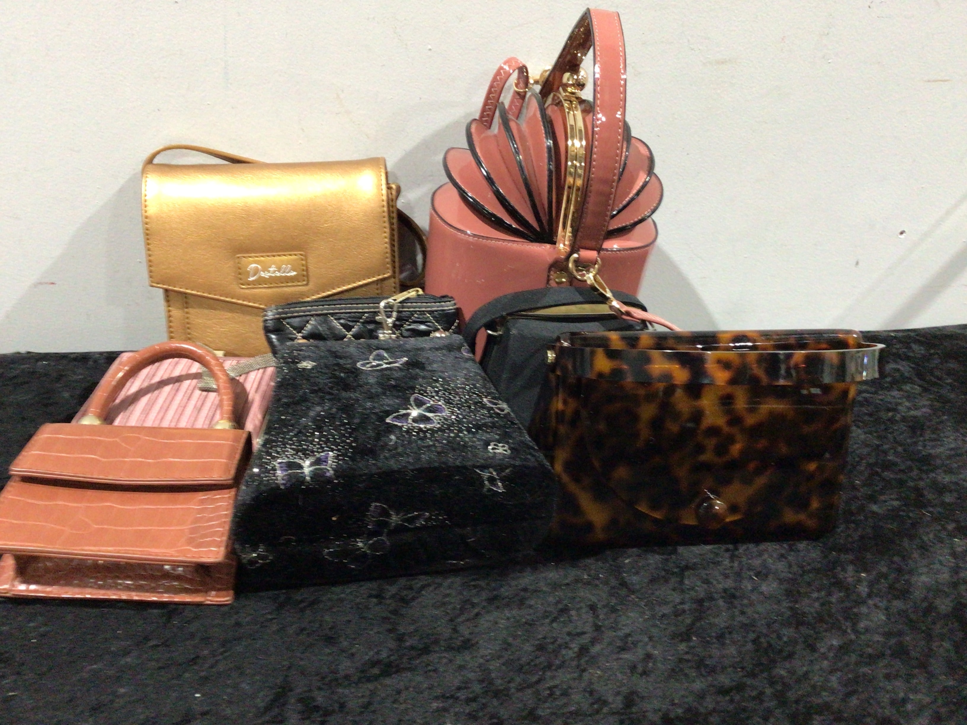 A collection of six contemporary women’s handbags and pouches. This assortment includes a metallic gold faux leather flap bag embossed with “Detalles” on its front, a structured pink patent-finish top-handle bag with a scalloped fan design and a gold-tone kiss-lock closure, and a small black fabric pouch or clutch adorned with silver and purple butterfly motifs, featuring a quilted top edge and a zipper with a silver-tone lobster clasp. Also present are a structured tortoiseshell-patterned acrylic box bag with a front clasp, a small tan/orange faux crocodile-embossed top-handle bag with a flap closure, and a partially obscured plain black shoulder bag.