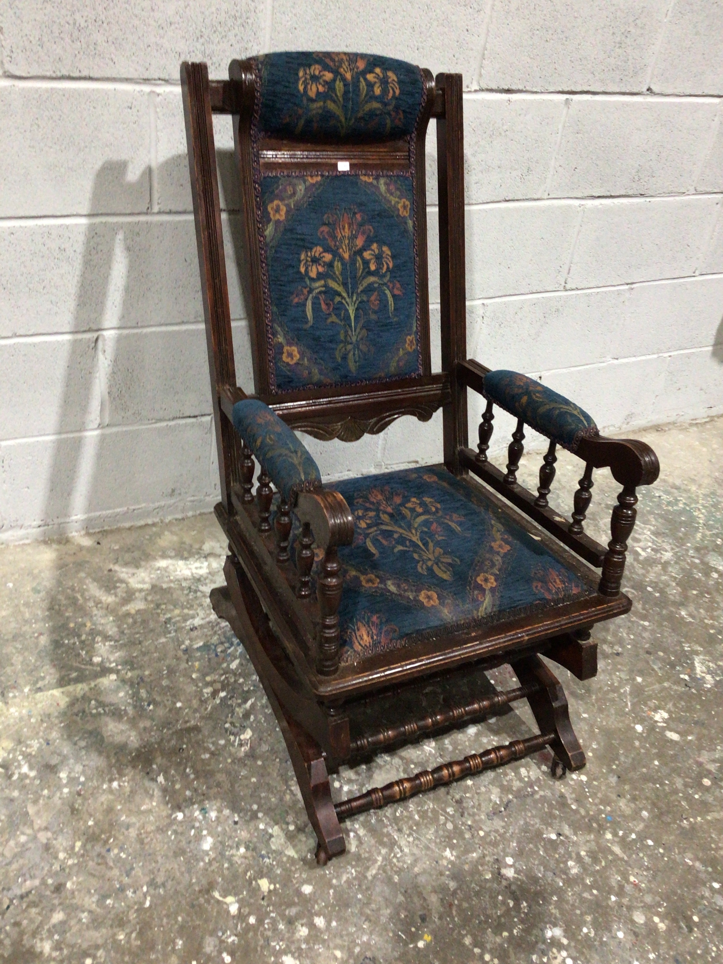A late 19th to early 20th-century American Victorian style platform rocking chair. The frame is constructed from dark-stained wood, possibly oak, featuring turned elements on the arms, legs, and stretchers. The chair is upholstered with a multi-panel tapestry or needlepoint fabric in a deep teal or blue-green color, adorned with ornate floral and foliate motifs in shades of orange, yellow, and green. A small, illegible white tag is affixed to the upper back upholstery.
