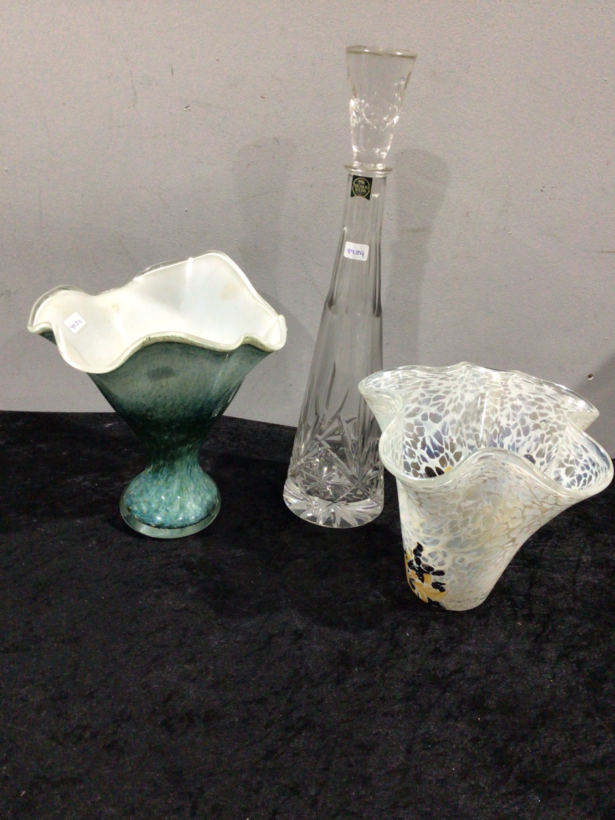 A Thomas Webb ‘Othello’ pattern crystal decanter, featuring a faceted stopper, a tapered body, and intricate cut patterns on its lower half. It bears a green and gold label near the neck identifying it as “THOMAS WEBB” and a white sticker marked “8929”. Accompanying this lot is a footed art glass vase or bowl with a flared, undulating rim, displaying an opaque white interior contrasting with a speckled teal to green exterior; a white sticker on its rim is marked “9929”. The third item is an organic-shaped art glass bowl or vase with a similarly ruffled rim, exhibiting a clear and opalescent base glass, intricately adorned with a dense, variegated pattern of white, black, and yellow speckles or fritwork.