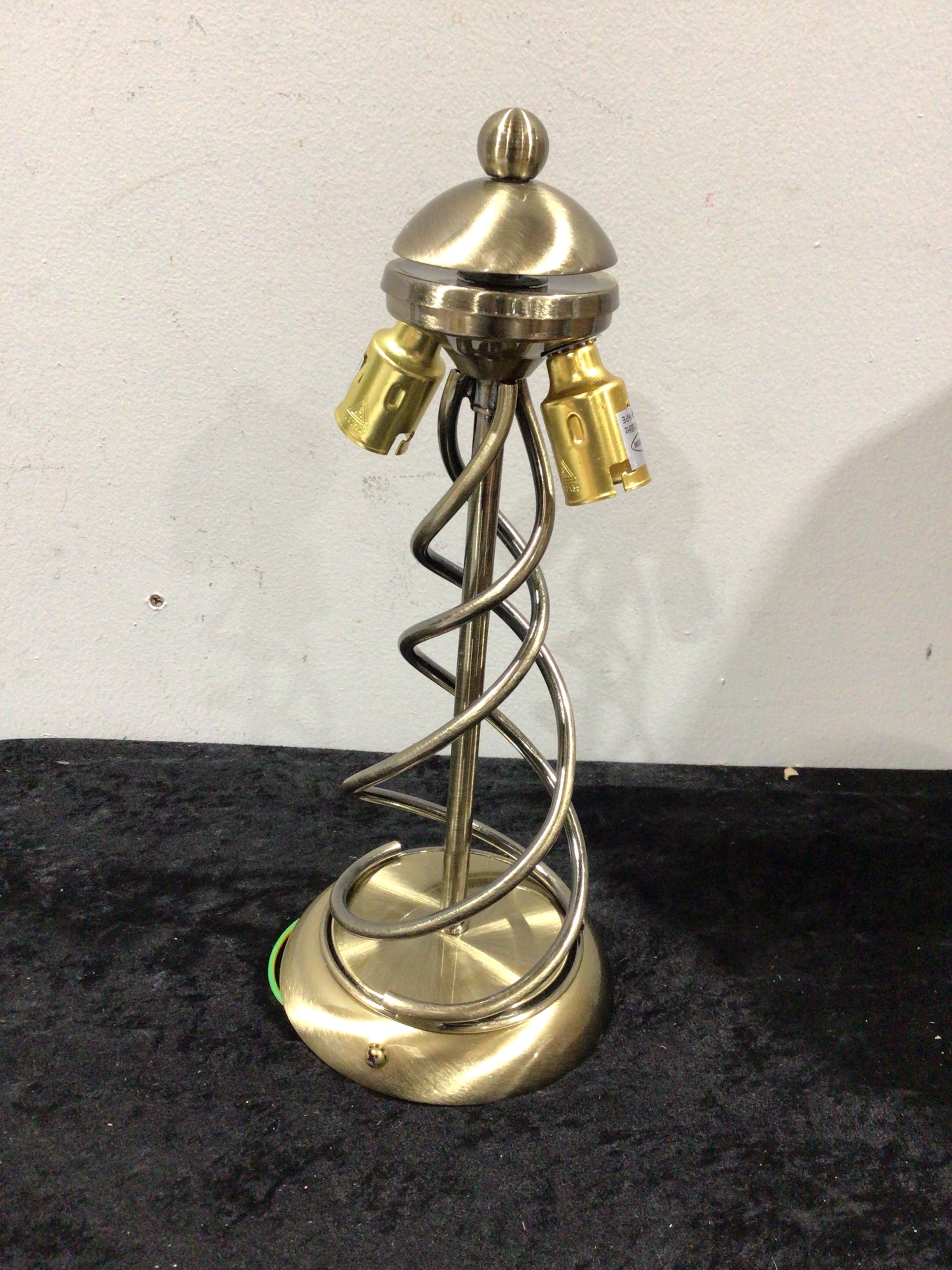 A set of four modern multi-socket Ceiling fixtures, constructed primarily from metal with a brushed or antique brass-tone finish. Each lamp features a central column encircled by three spiraling arms, culminating in a domed cap topped with a spherical finial and three exposed E-type bulb sockets, which are a brighter polished brass hue. Each fixture stands on a round, weighted base. Visible markings on the bulb sockets include a stylized “S” with a lightning bolt, possibly a safety certification mark, and a partial sticker showing “ZH06” and “50HZ, ” indicating a 50 Hertz electrical frequency, suggesting design for markets outside North America.
