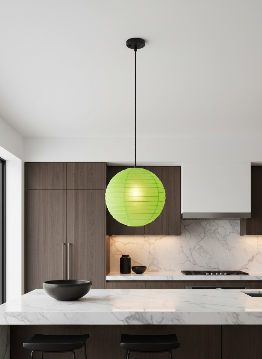 A lot of 60 vibrant lime green 14 inch spherical collapsible paper lanterns.