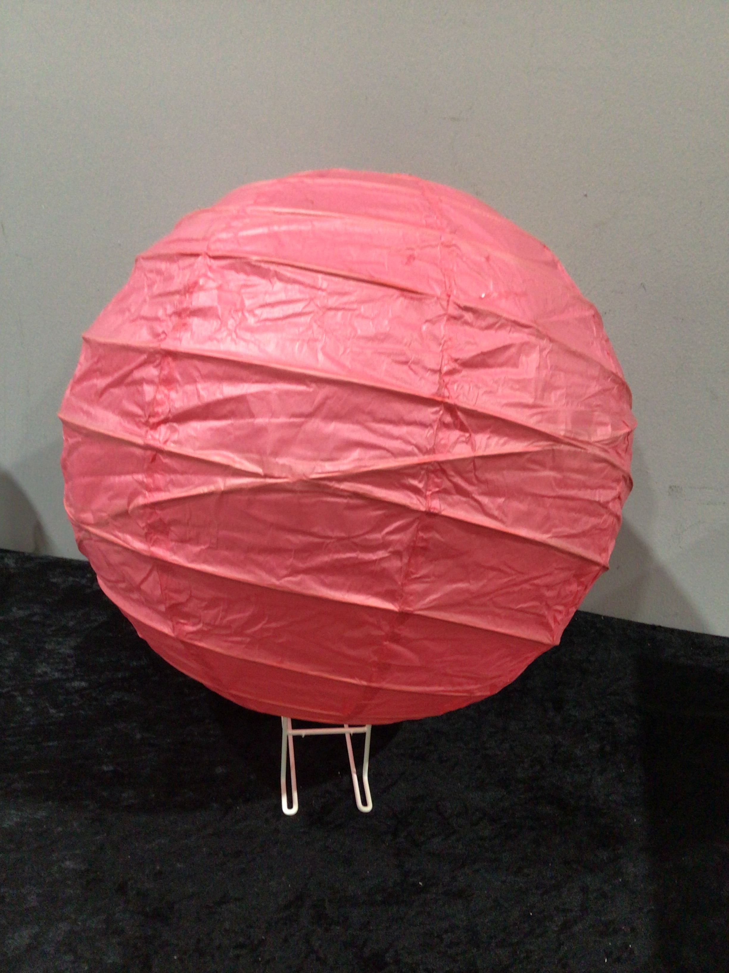 A lot of 50 round pink paper lanterns, approximately 14 inches, with one shown resting on a white wire stand.