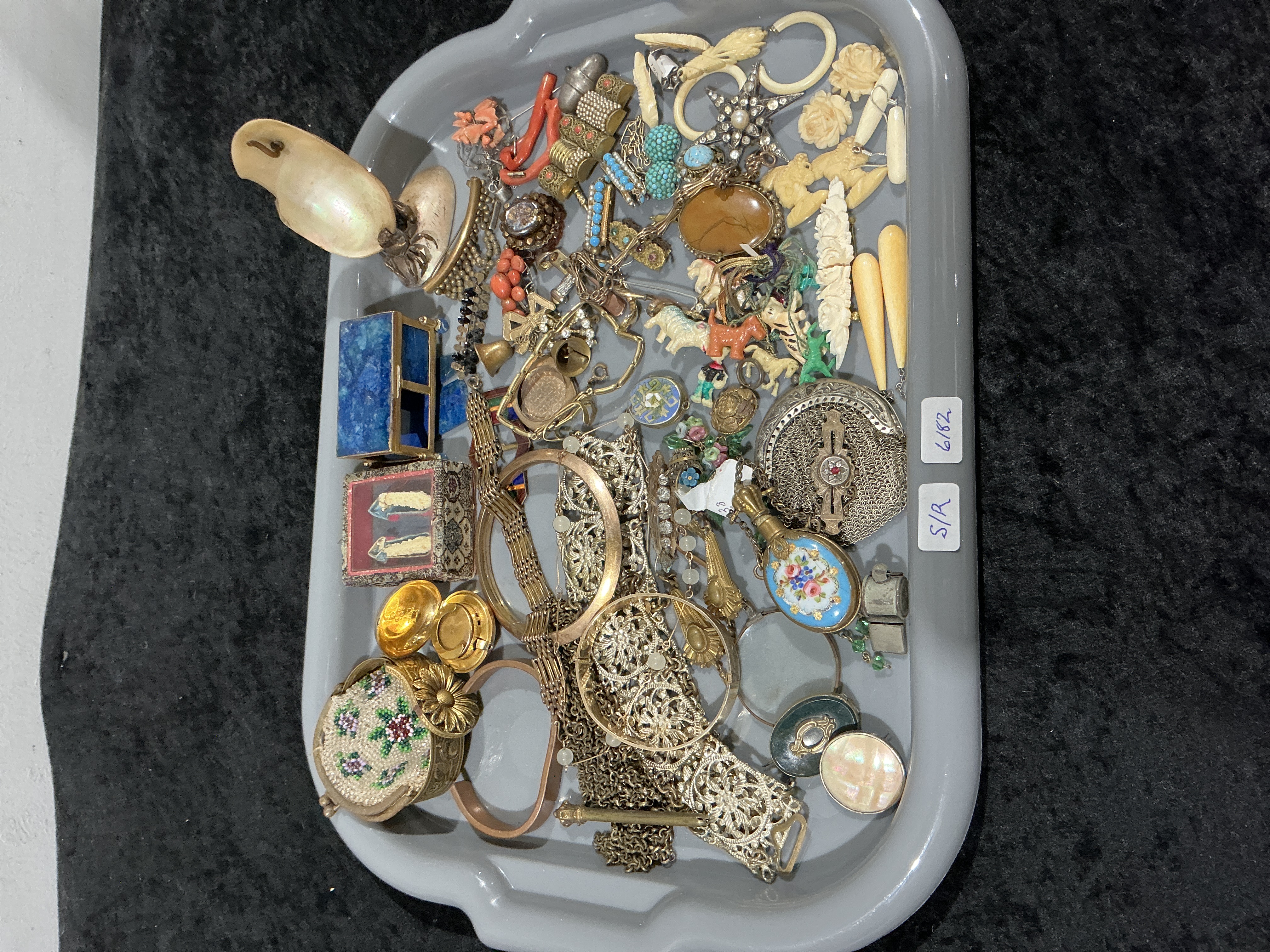 Notable pieces include several bangles and chains, a micro-beaded reticule, a metal mesh reticule, multiple decorative boxes (one appearing as lapis composite), several brooches (including a large star-shaped rhinestone piece and an enameled floral oval locket/perfume bottle), and a cluster of metal thimble covers. The collection also features carved components, including coral branches and simulated bone roses. The items are offered as a mixed lot of costume jewellery ware items. Two white inventory tags marked S/R and 6182 are visible in the tray.