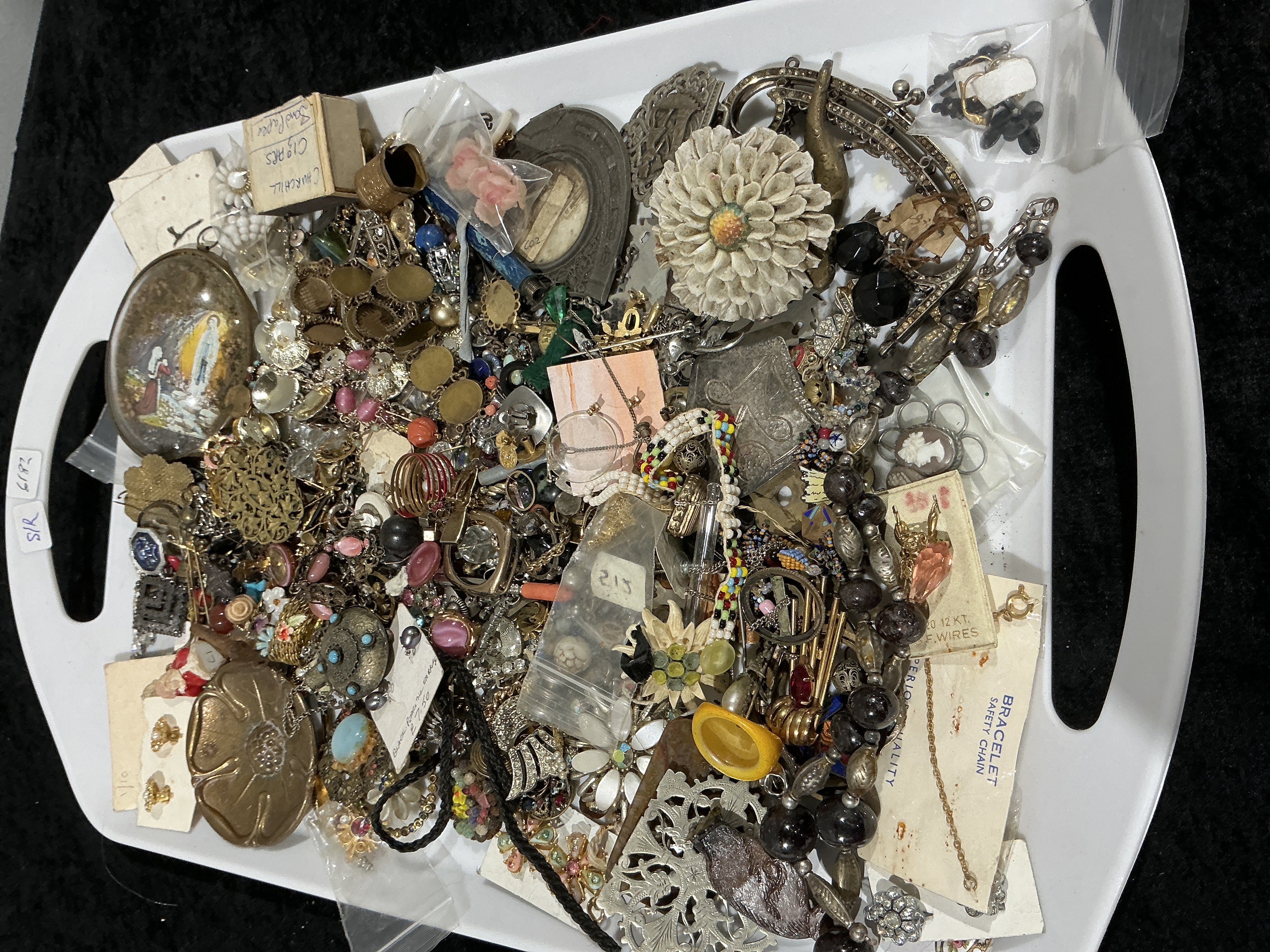 A large, heterogeneous collection of vintage costume jewellery ware and components presented in a white plastic storage tray marked S/R 6182. The lot is intended primarily for spares or repairs, repurposing, or craft projects. Materials include base metals (gold-tone, silver-tone, brass), glass rhinestones, various plastics (phenolic, molded flowers), faux pearls, glass beads, and carved shell, including one small cameo. The collection encompasses a wide variety of items such as large floral brooches (including one carved cream-colored piece), filigree pins, beaded necklaces, clip-on and pierced earrings, chains, lockets, and various findings and loose beads. Observable novelty items include a small metal thimble and a pair of pince-nez style glasses. Several items retain original packaging or labels, some marked BLACK ROSE OIL EARRINGS P. 7.50, BRACELET SAFETY CHAIN, and a miniature matchbox labeled CHURCHILL CIGARS Sand Paper.
