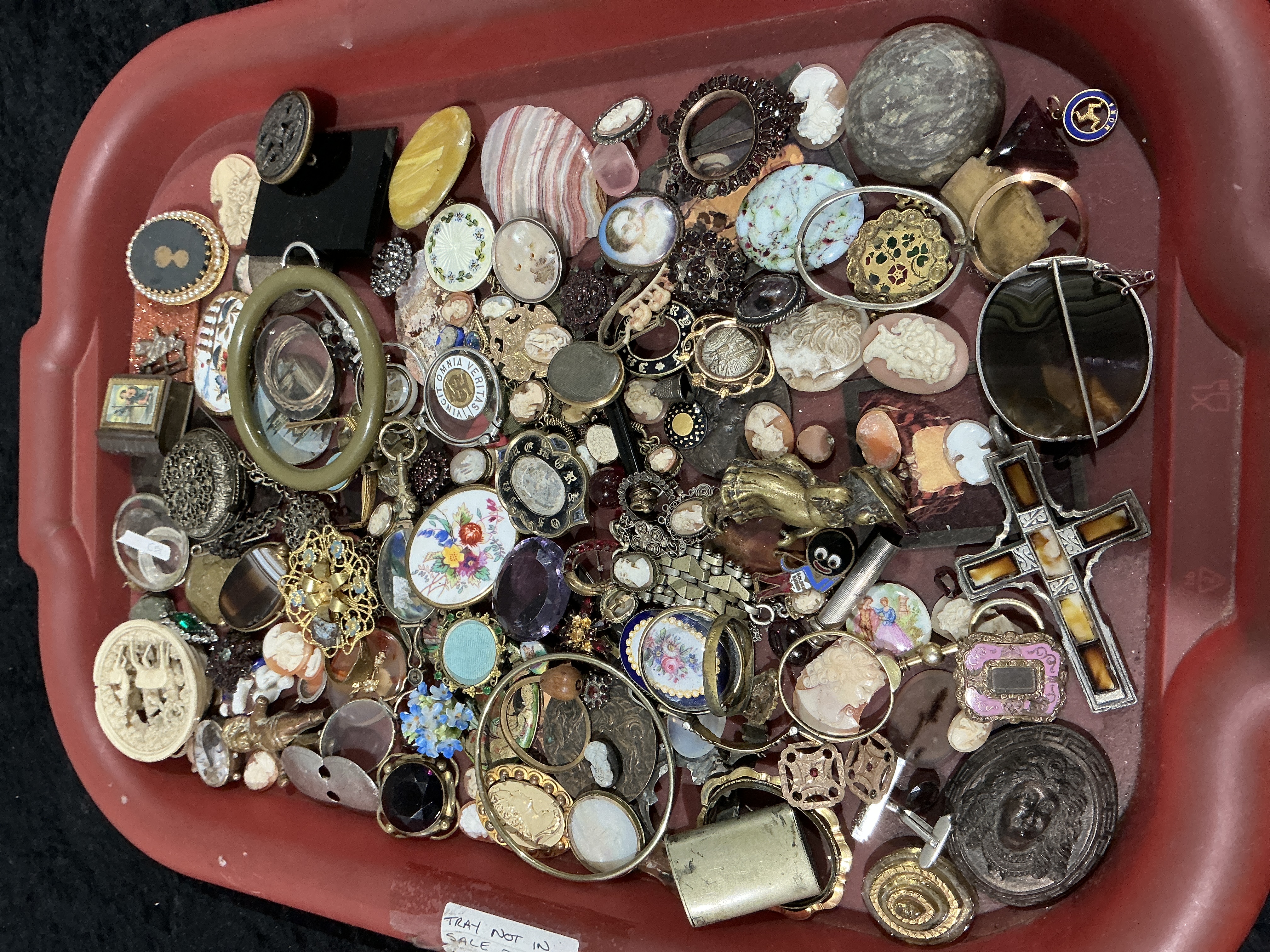 A highly dense collection of 83 items comprising antique and vintage costume jewellery ware, components, and findings, suitable primarily for spares or repair projects. The assortment spans styles from the late Georgian, Victorian, and Edwardian periods, utilizing base metals (brass, silver tone, gold tone), carved shell, various hardstones (including banded agate, tiger’s eye, and polished quartz), garnet clusters, enamel, and paste stones. The lot includes numerous carved shell cameos, several lockets, brooches, pendants, cufflink sets, buttons, and loose stones. Notable pieces include a circular locket inscribed in Latin VINCIT OMNIA VERITAS (Truth conquers all things), a miniature book-form locket with a painted religious image, a silver-toned cross inlaid with banded brown agate segments, a carved bone medallion, a small brass figurine, and a small blue enamel charm marked MONA featuring the Triskelion symbol.