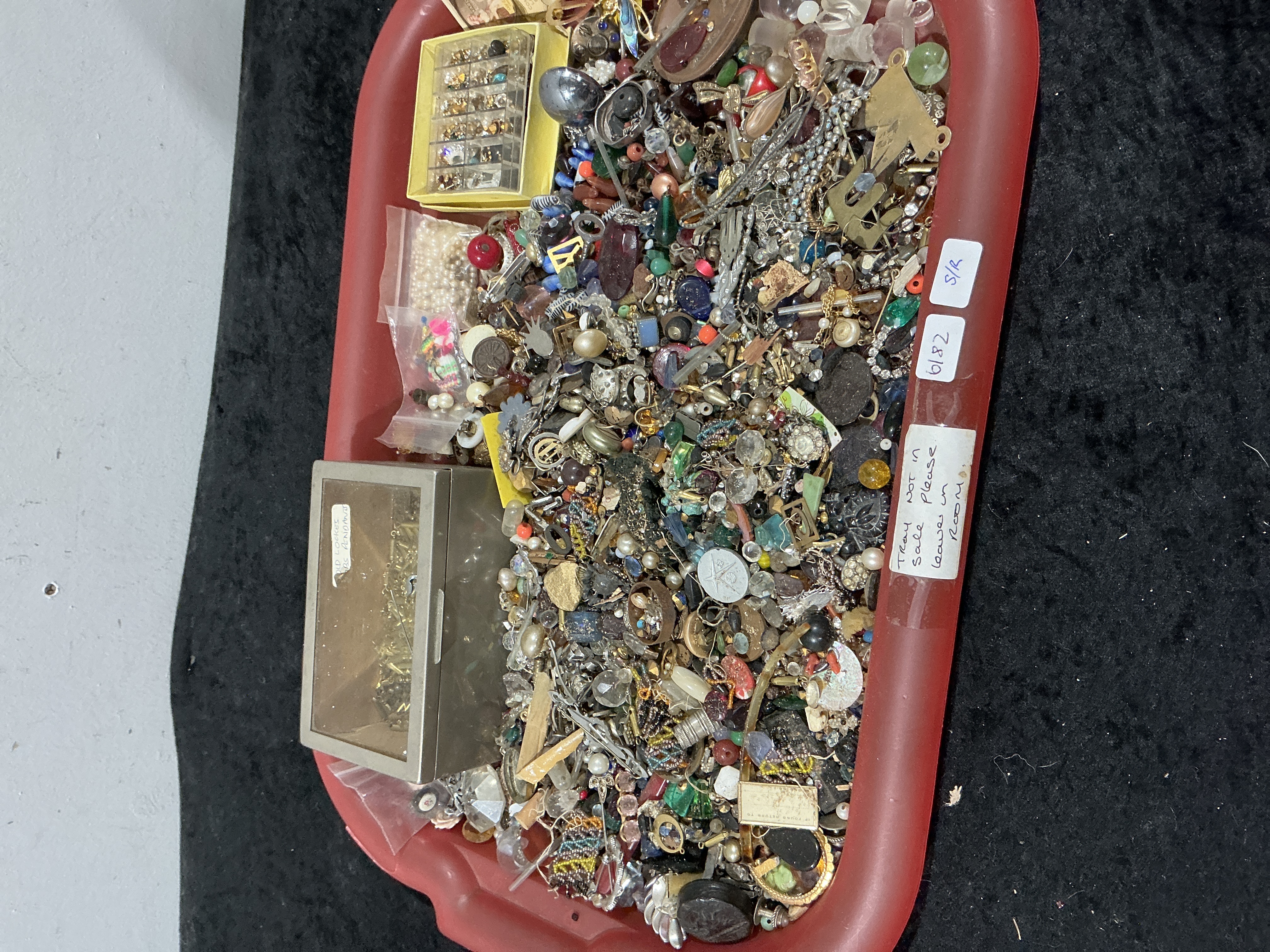 A substantial bulk lot of mixed vintage and modern costume jewellery, components, findings, and beads, presented loosely within a red plastic tray. The collection includes items intended for spares and repair, repurpose, or craft use. Materials are highly varied, consisting of base metals (both silver-tone and gold-tone finishes), imitation pearls, glass beads, plastic, and resin, set with countless rhinestones and imitation stones in assorted colors and cuts. The lot contains various forms of jewelry including brooches, rings, pendants, earrings, and chains. Visible within the main pile are three packaged subsets: a small opaque gray box labeled GOLD LOCKETS ORS PENDANT; a small zip-top bag containing imitation pearl beads; and a yellow cardboard box containing a 12-compartment plastic insert filled with twelve distinct small items, likely earrings or rings. The overall style is highly heterogeneous, spanning multiple decades. The red plastic tray itself is marked with inventory labels 6182 S/R and a handwritten note indicating the container is NOT in Sale please leave in Rooms.