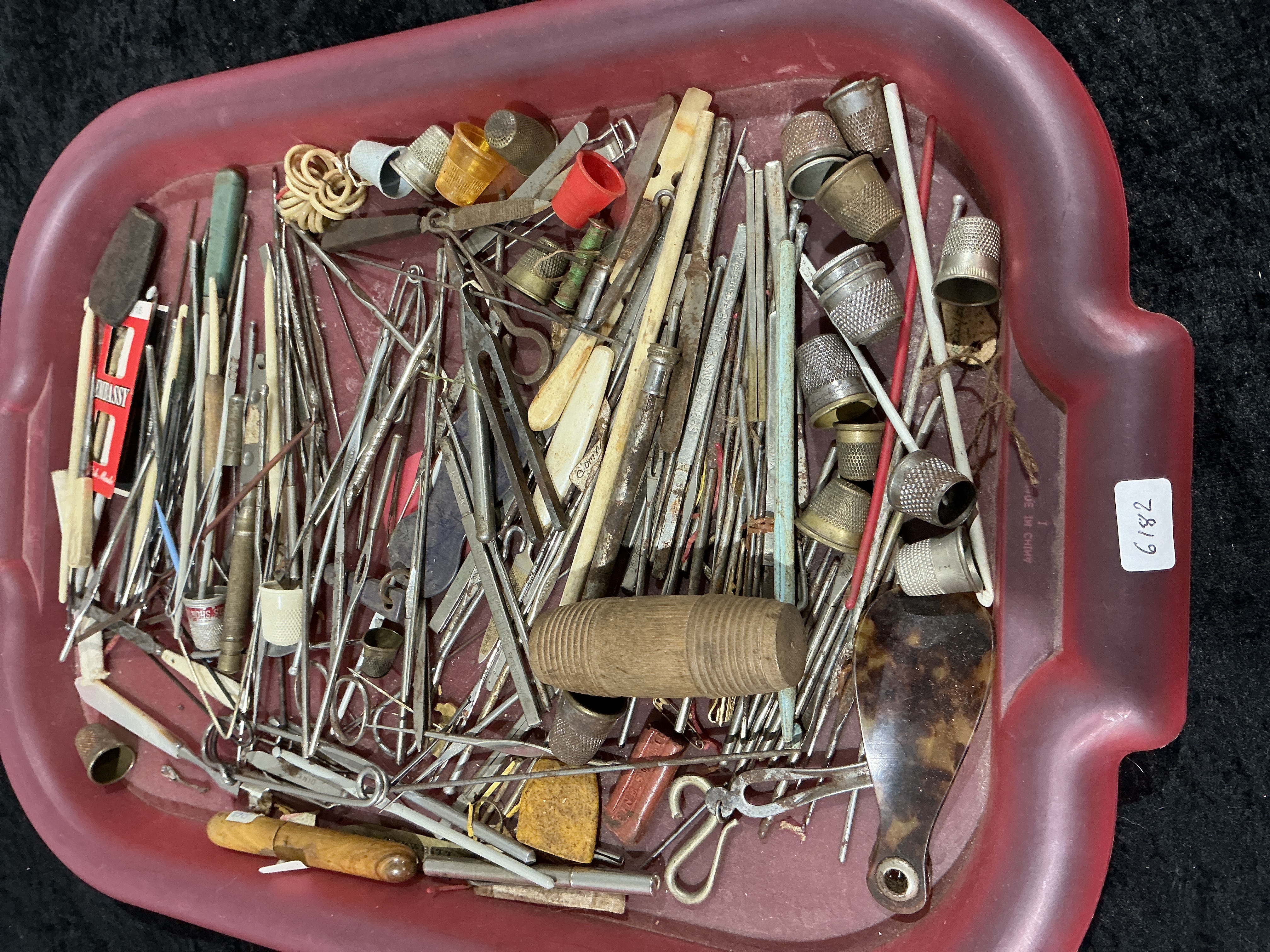 A large miscellaneous collection of 77 items, commonly referred to in the market as a “junk drawer lot,” comprising vintage sewing, tailoring, and small craft implements. The collection includes 14 mixed thimbles made of brass, silver-toned metal, and plastic in red and amber hues. Also present are two large wooden handles or bobbins, one tortoiseshell-patterned paddle tool, and a bulk quantity of approximately 62 small metal instruments, including probes, files, tweezers, hooks, awls, and small scissors. Materials observed include steel, brass, wood, plastic, and bone or ivory substitute. Visible markings on some tools include SHRIMPTONS ECLIPSE and PATENT 5091/11. The entire collection is presented in a modern, rectangular, reddish-pink plastic tray marked MADE IN CHINA and labeled 6182.