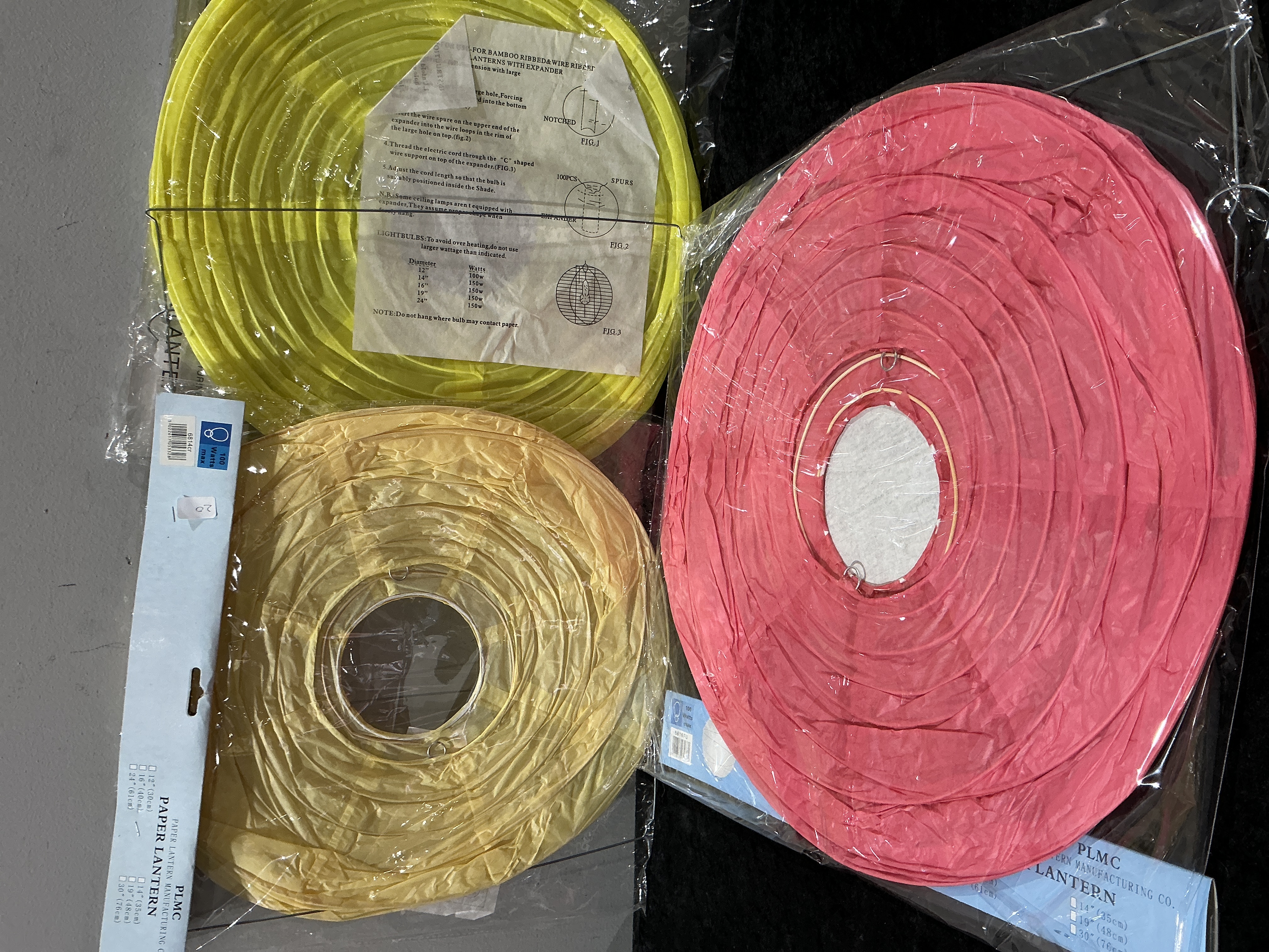 A substantial collection of 120 New Old Stock (NOS) decorative paper lanterns manufactured by PLMC Manufacturing Co. This lot comprises various colour paper and material lantern shades, designed to be expanded into spherical hanging lampshades using internal metal wire supports. The collection includes multiple colors, visibly featuring yellow/cream, chartreuse/lime green, and hot pink/fuchsia examples. Each lantern is sealed flat in its original clear plastic packaging with an attached blue cardboard header. Packaging indicates that the paper lantern shades are available in multiple diameters ranging from 12 inches (30cm) up to 30 inches (76cm). Electrical specifications noted on the packaging state a maximum bulb output of 100 Watts max.