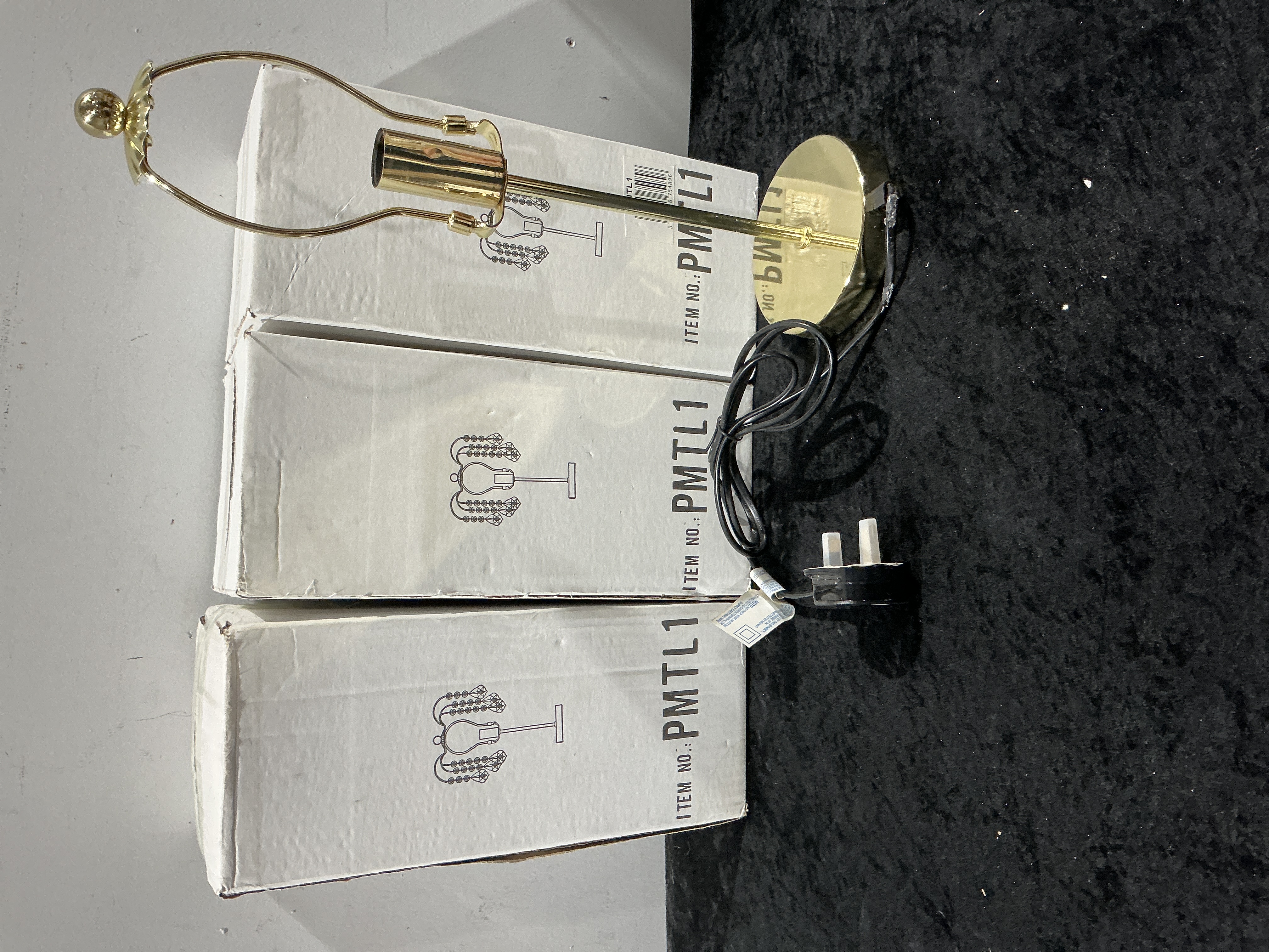A collection of four contemporary accent table lamp lots. The collection comprises three identical, factory-packaged units and one loose, unassembled lamp base component. The three packaged items are contained within white cardboard boxes, each marked with the identifier ITEM NO.: PMTL1 and featuring a line drawing depicting a small, crystal-draped accent lamp design. The loose component is a small table lamp base assembly constructed of polished yellow metal, likely brass or brass-tone plating. This base features a flat circular foundation, a central stem, and an attached harp and finial structure. The electrical component includes an attached black power cord terminating in a three-pronged UK-style (Type G) plug. The lot is sold as four items, consisting of three boxed kits and one loose base unit.