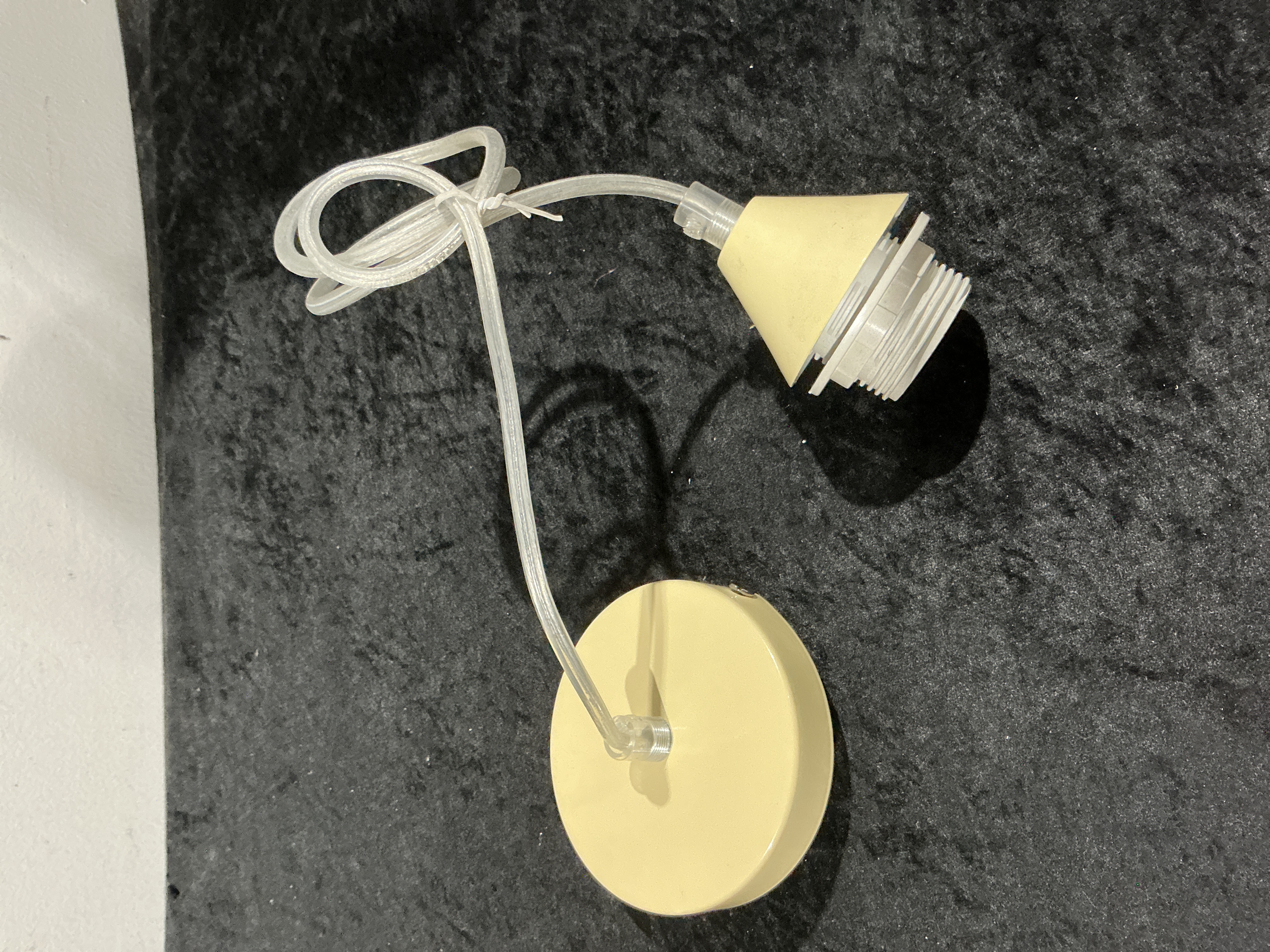 A collection of 60 contemporary or Mid-Century Modern style pendant lighting suspension assemblies. Each assembly consists of a circular ceiling rose (canopy) and a coordinating tapered lampholder cover, both finished in a glossy light yellow or cream color. The components are likely constructed from plastic or painted metal, consistent with 1970s lighting hardware. The main components are connected by a length of clear, translucent plastic-sheathed electrical cable. The lampholder fitting is constructed of white or translucent ribbed plastic, featuring visible screw threads designed to accept a standard bulb and retain a lampshade. No manufacturer markings or rating text are visible on the representative sample.
