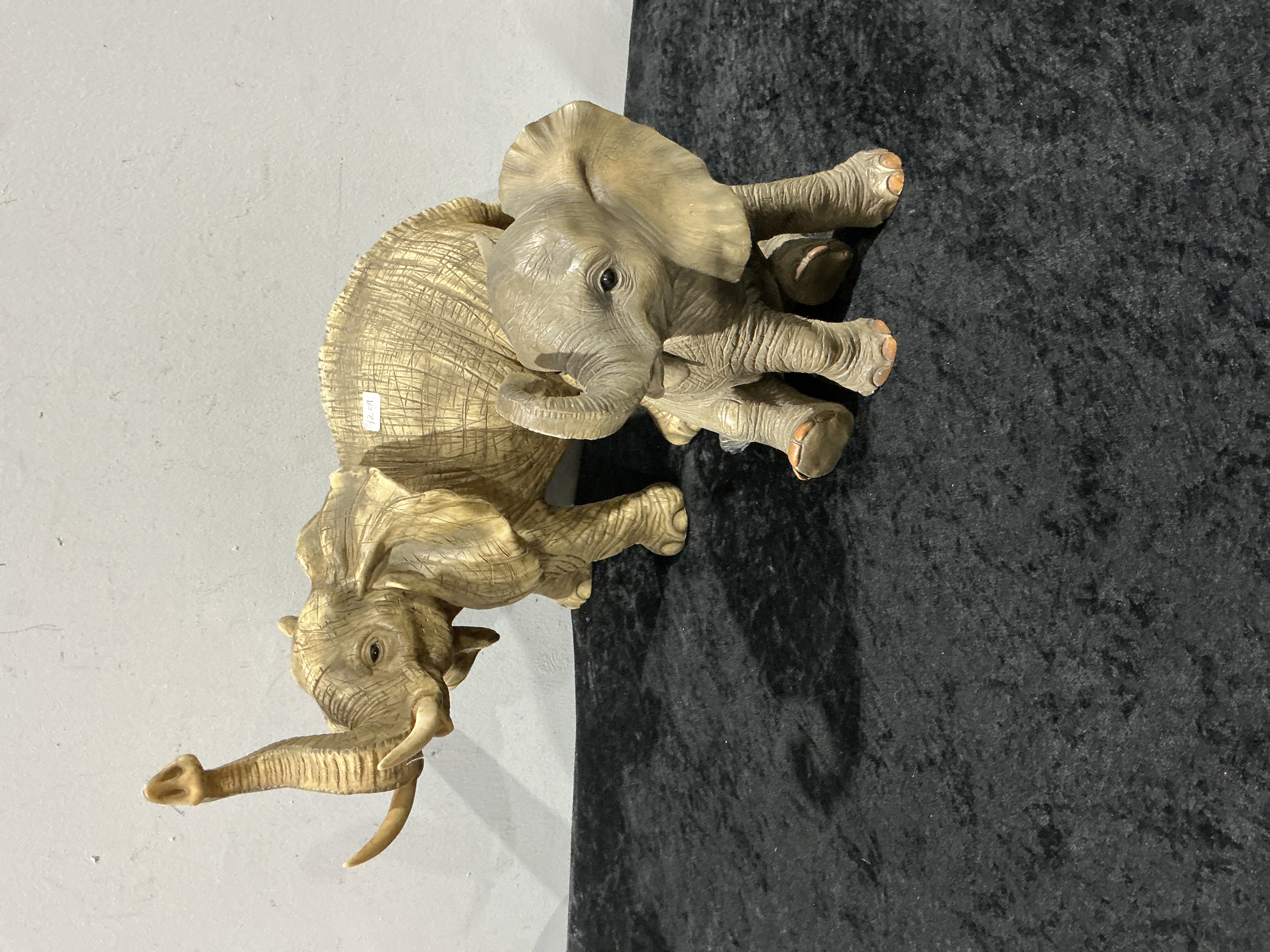 A pair of decorative animal figurines, constructed from molded resin or polyresin, depicting an adult and a juvenile elephant. The larger adult figure stands with its trunk raised high and features a golden-tan finish with a highly textured surface intended to simulate carved wood grain, complete with simulated tusks. The smaller juvenile figure is posed sitting or kneeling with a moderately raised trunk, featuring a smoother, greyish-tan finish. Both figures display detailed modeling of skin folds and have painted toenails in an orange-brown tone. The larger elephant has a white rectangular inventory sticker affixed to its back inscribed with the numbers 92.01. The style is consistent with contemporary mass-market decorative objects.