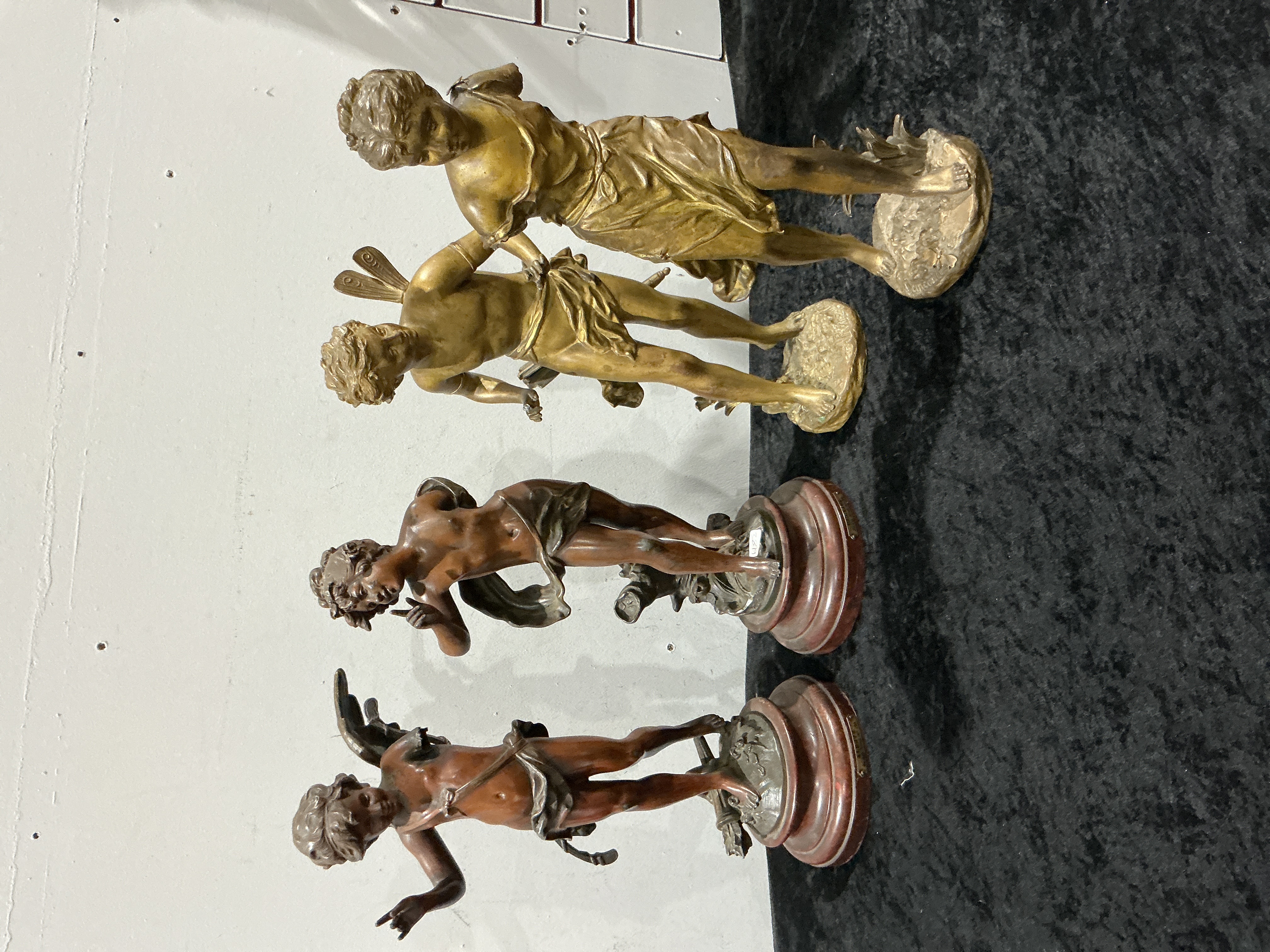 A collection of four cast metal figurines, identified through web consensus as spelter sculptures after Auguste Moreau, depicting classical youths or putti. These metal figurines are consistent with late 19th or early 20th Century French decorative sculpture. The lot includes two distinct pairs. The two figures on the left exhibit a reddish-brown patination and are mounted on round, stepped bases appearing to be mottled red marble. One marble base features a small plaque with partially visible text (e.g., “…MAR…”) and the other bears a white inventory sticker marked “UZ2.” The two figures on the right exhibit a golden or gilt patina and stand on textured self-bases.