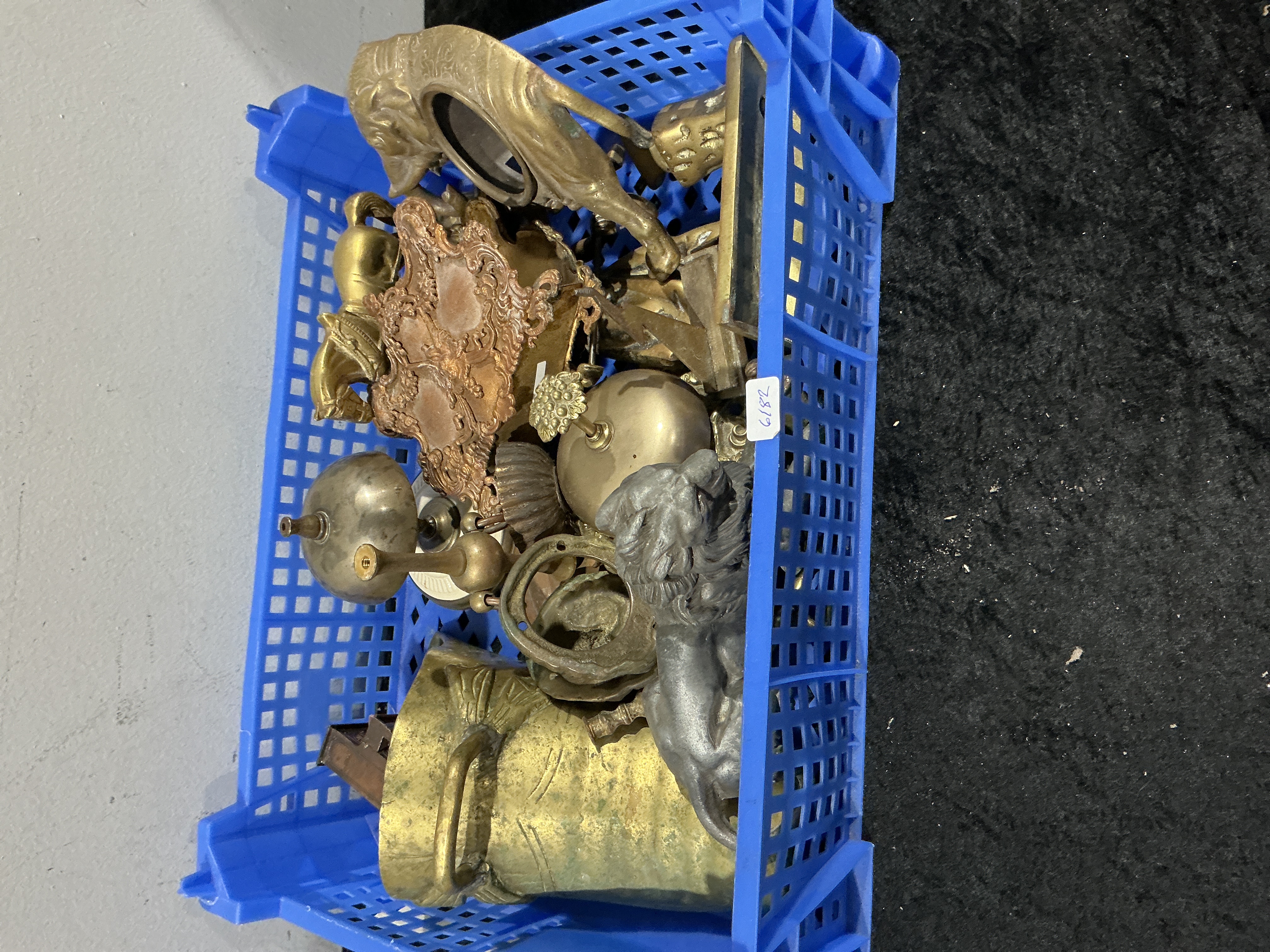 A collection of 15 pieces of mixed decorative metal salvage, likely components from French and Victorian mantle clocks, garnitures, and architectural accessories. The assortment is predominantly composed of tarnished brass and bronze elements, with one item appearing to be dark patinated cast metal, possibly pewter or cast iron, in the form of a reclining lion figurine or paperweight. Other components include a large verdigris-patinated brass vessel, two dome-shaped bells or finials, and several fragmented components consistent with clock works or garniture ornamentation. Notable pieces include an ornate rococo-style repoussé plaque and a stylized animal-form clock frame component. The items are metal figurines and components that all need to be restored to be functional or complete.