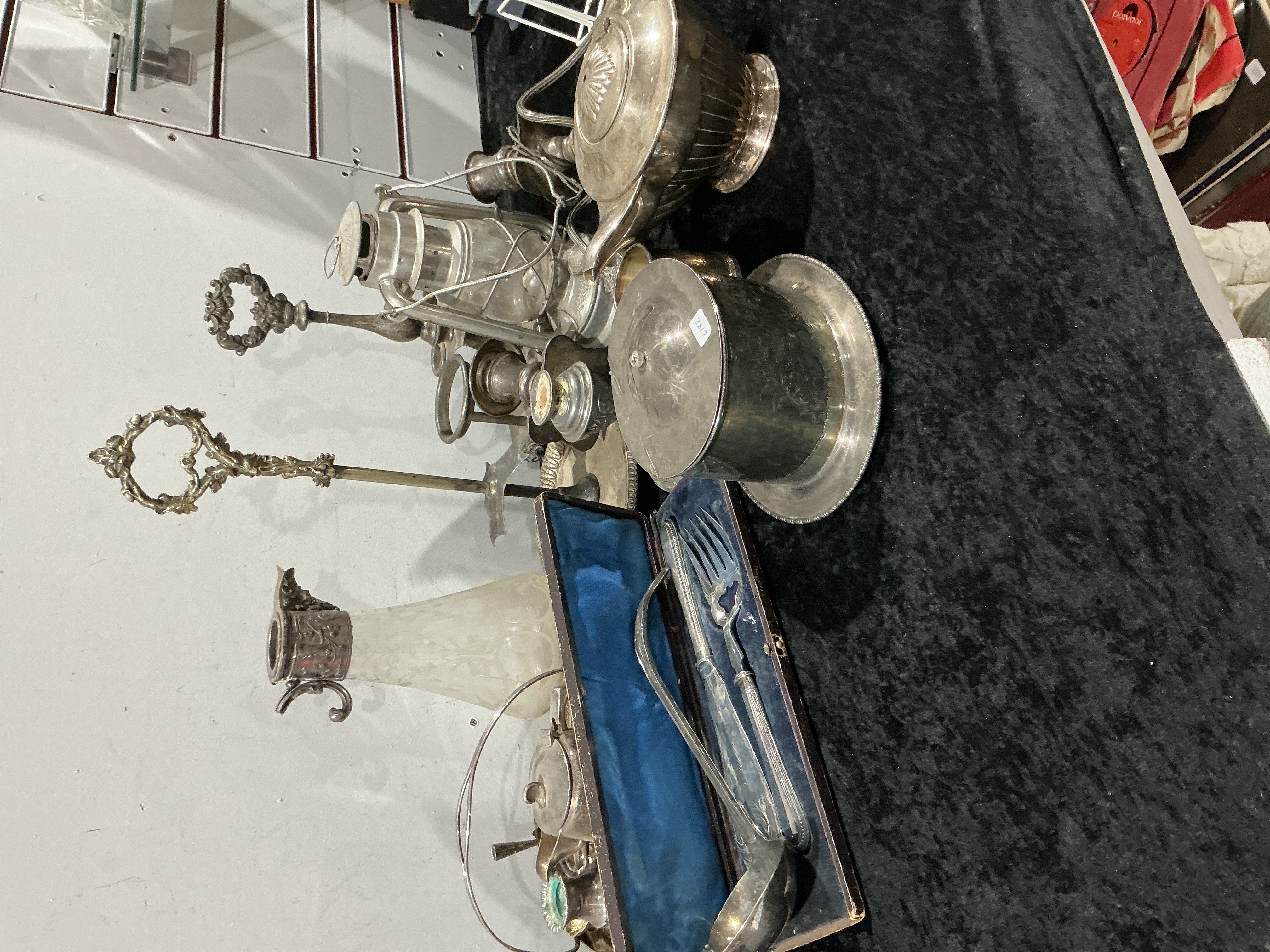 A collection of 17 mixed metal and glass objects, primarily consisting of silver-plated functional and decorative ware. The lot includes a tall etched glass decanter with a silver-plated collar and handle, a large silver-plated ribbed teapot, and a glass hurricane lantern housed in a plated metal frame. Also present is a cylindrical silver-plated lidded box resting on a matching plated platter, bearing a white adhesive sticker marked ‘6182’. The collection features a small four-piece silver-plated service caddy set, comprising the caddy frame, a creamer, a covered pot, a small salt cellar, and a spoon. Additionally, there is a fitted presentation box, lined in blue velvet, containing three silver-plated serving utensils: a ladle, a fork, and a knife. The collection is completed by two ornate tall decorative stands or finials, appearing to be brass or bronze. These metal objects are presented for restoration.