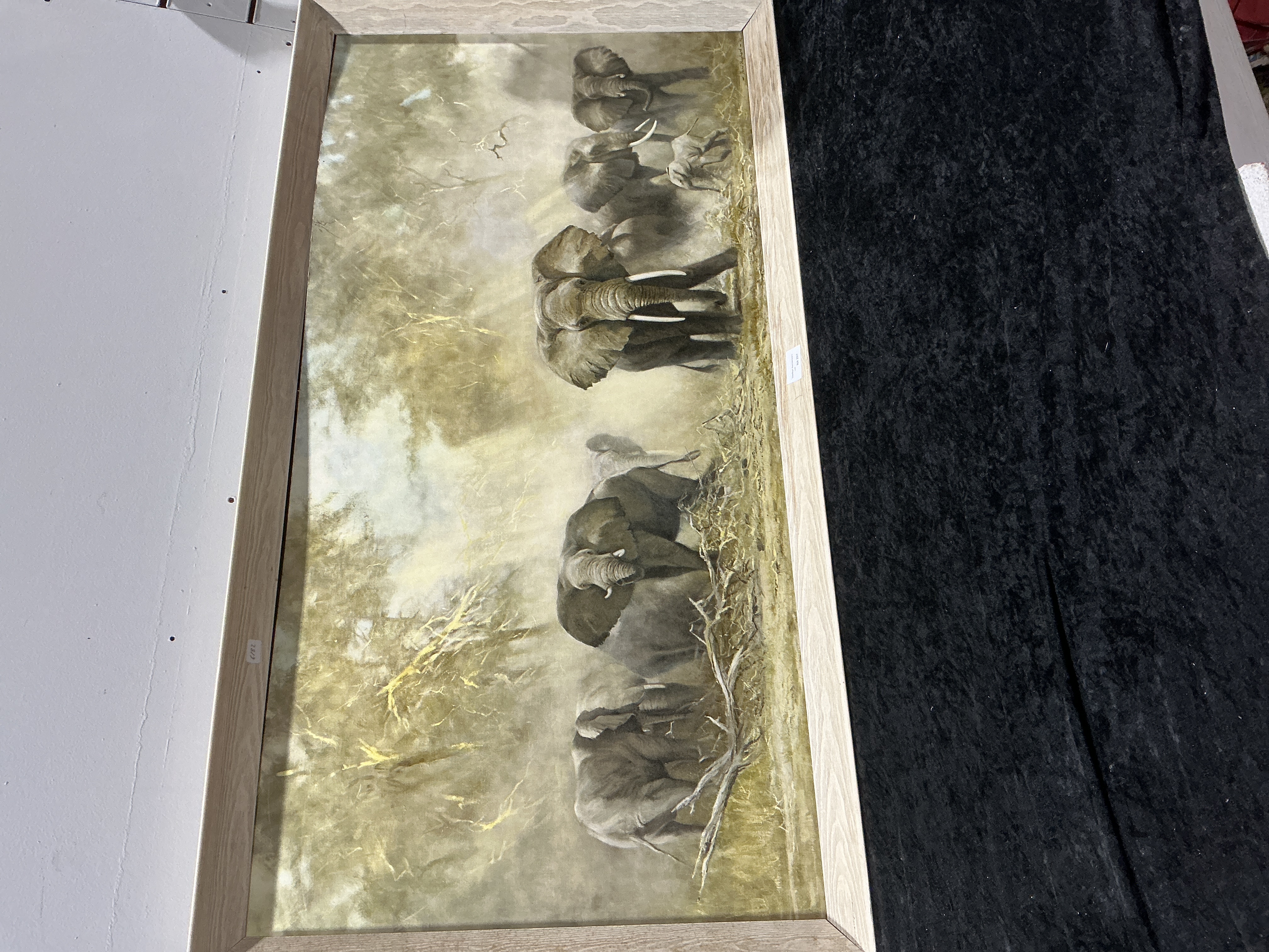 A large panoramic reproduction print, likely a giclĂ©e or print on board, executed after the iconic 1962 work ‘Elephants at Amboseli’ by David Shepherd. The artwork depicts a herd of seven African elephants traversing a dusty savanna landscape, characterized by dramatic shafts of light cutting through the haze and foliage. The print is mounted within a simple, pale natural wood frame. A signature is visible in the lower right corner, appearing to read “Russ Shepherd – ’98.” Additional inventory markings are present on the frame, including “6/82” on the upper right edge and a sticker reading “Box 3017” on the lower center.