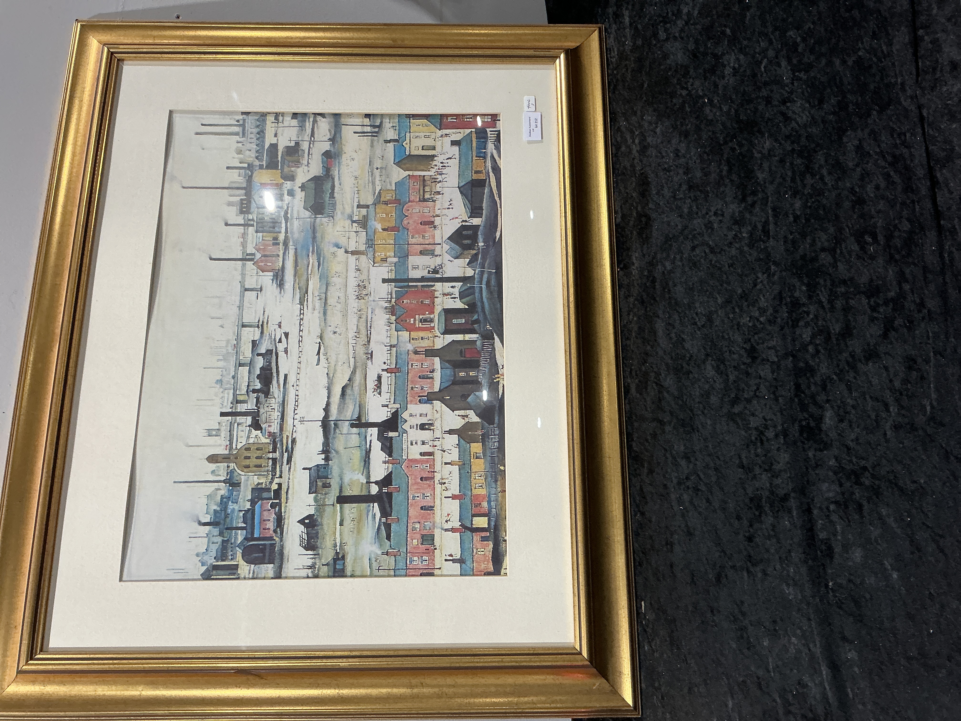 A single framed color print or offset lithograph executed in the style of Laurence Stephen Lowry (1887-1976), depicting a dense industrial townscape. The scene features numerous polychrome terraced houses, large factories with multiple tall smokestacks, and a waterfront area populated by small, ‘matchstick’ figures. A viaduct and boats are visible in the background. The print is presented under glazing, mounted with a wide, off-white mat, and housed within a substantial, polished gold-toned wooden frame. Visible markings include an auction label affixed to the lower right corner of the mat reading “Sheldons Auctioneers Ltd lot 212,” accompanied by a handwritten notation “9006 D.”