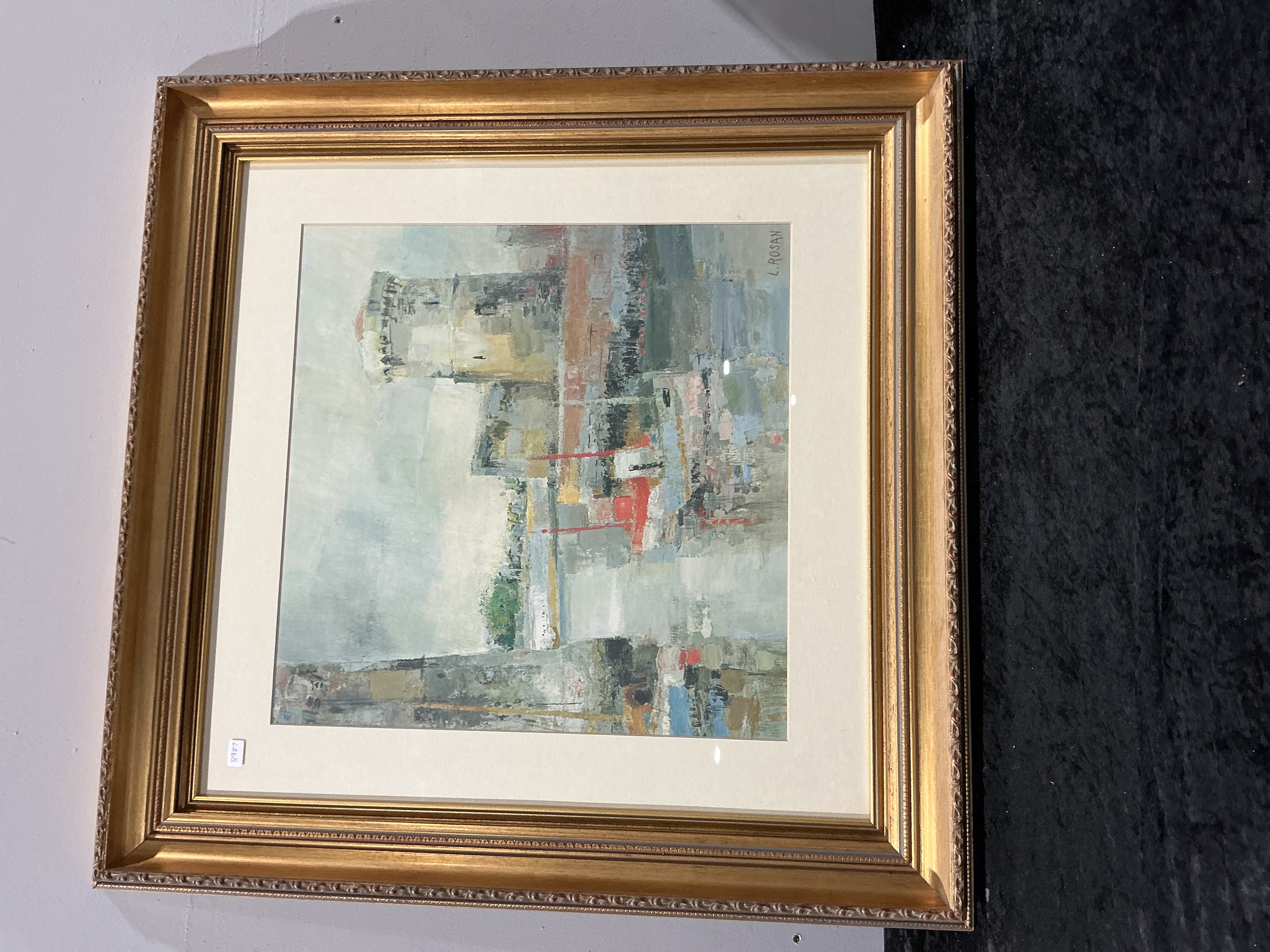 A single framed artwork, executed in watercolor or mixed media on paper, depicting an expressive harbor scene. The composition is dominated by large stone fortification towers reflected in the water, with small boats visible in the foreground. The work is signed L. ROSAN in the lower right quadrant. It is presented under glazing within a wide, ornate giltwood or gesso frame, complemented by an off-white mat. An inventory sticker displaying the number 8987 is adhered to the upper left corner of the mat.