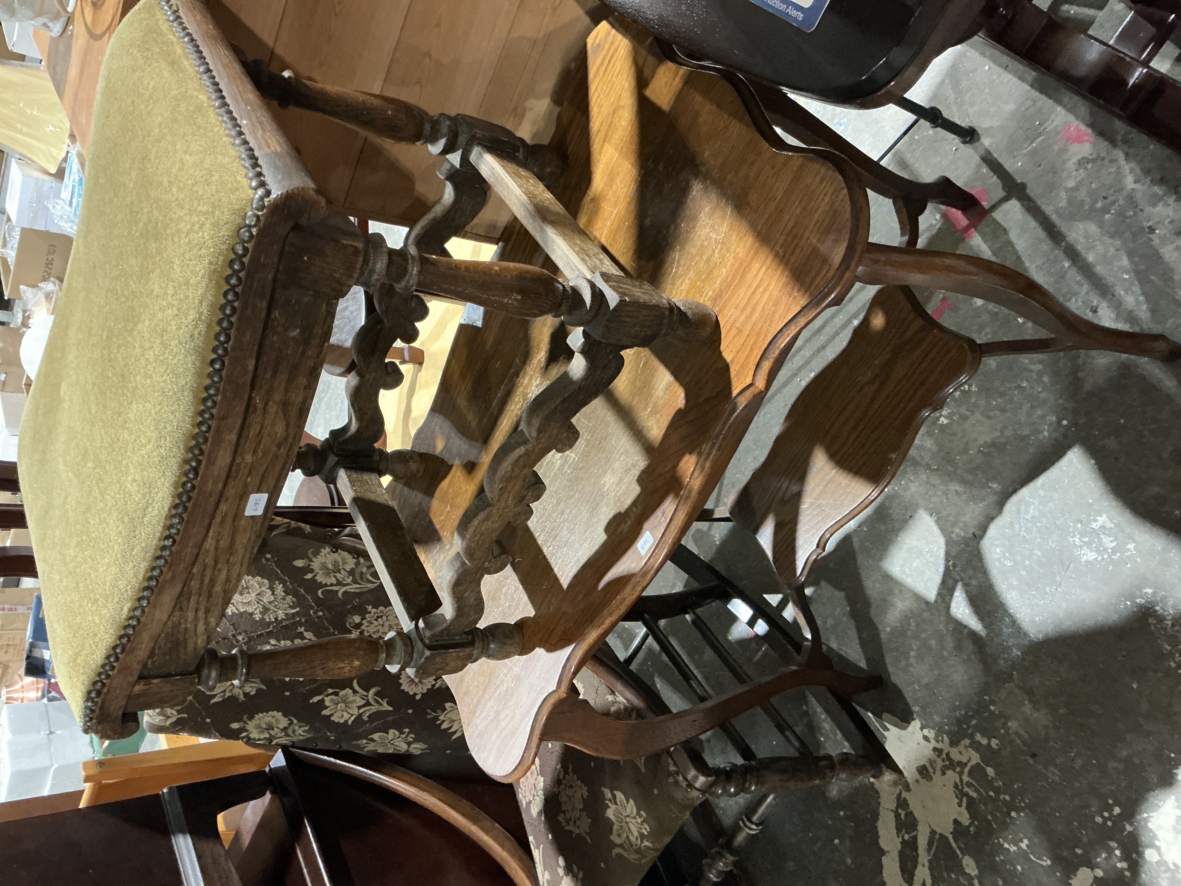 This lot comprises two distinct pieces of furniture: an upholstered stool and a two-tiered occasional table. The stool is constructed with a dark-toned wooden frame featuring four heavily turned legs connected by scrolled stretcher supports, suggesting a Baroque or Louis XIII/XIV style influence. The rectangular seat is upholstered in an olive/moss green plush fabric, secured by continuous metal tack trim. A white inventory label reading “G182” is affixed to the wooden frame of the stool. The accompanying occasional table is a two-tiered structure made of medium-toned hardwood with a lustrous finish. Both tiers feature serpentine or scalloped edges and are supported by slender, curving legs, indicative of a later style such as Louis XV or Queen Anne Revival.