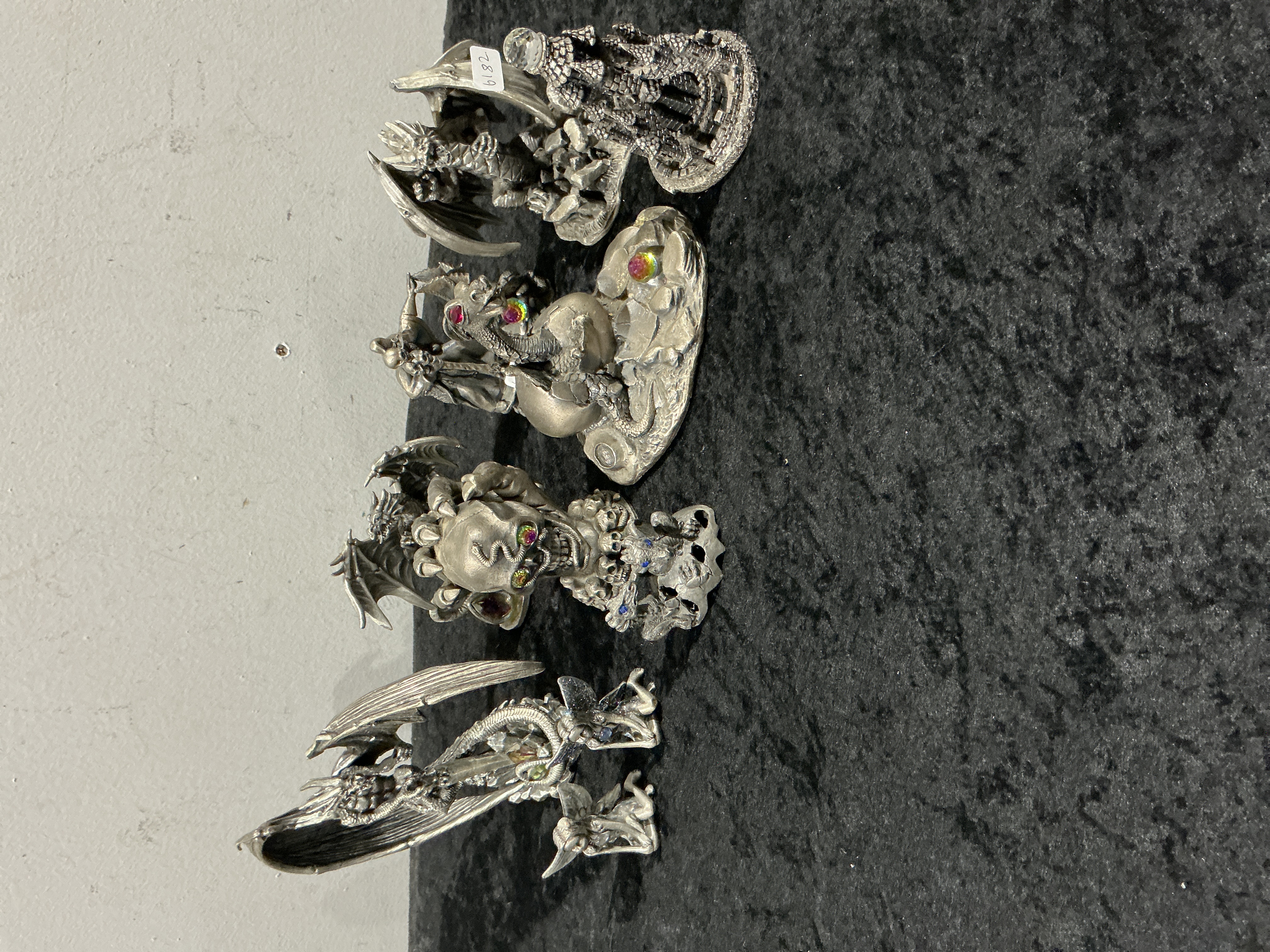 A collection of nine cast metal alloy figurines from the Tudor Mint Myth and Magic series. Each piece features a bright silver-tone finish and is dynamically sculpted with fantasy and gothic motifs. The metal is likely pewter or a similar contemporary alloy. The subjects include dragons, a wizard figure, a skull, and a miniature castle tower. The figurines are accented with embedded, multi-colored iridescent imitation faceted jewels. The specific subjects include a winged dragon standing on a crystalline base, a winged dragon perched atop a skull, a wizard figure on an oval base with a coiled dragon, and a dragon figure standing before a castle tower.