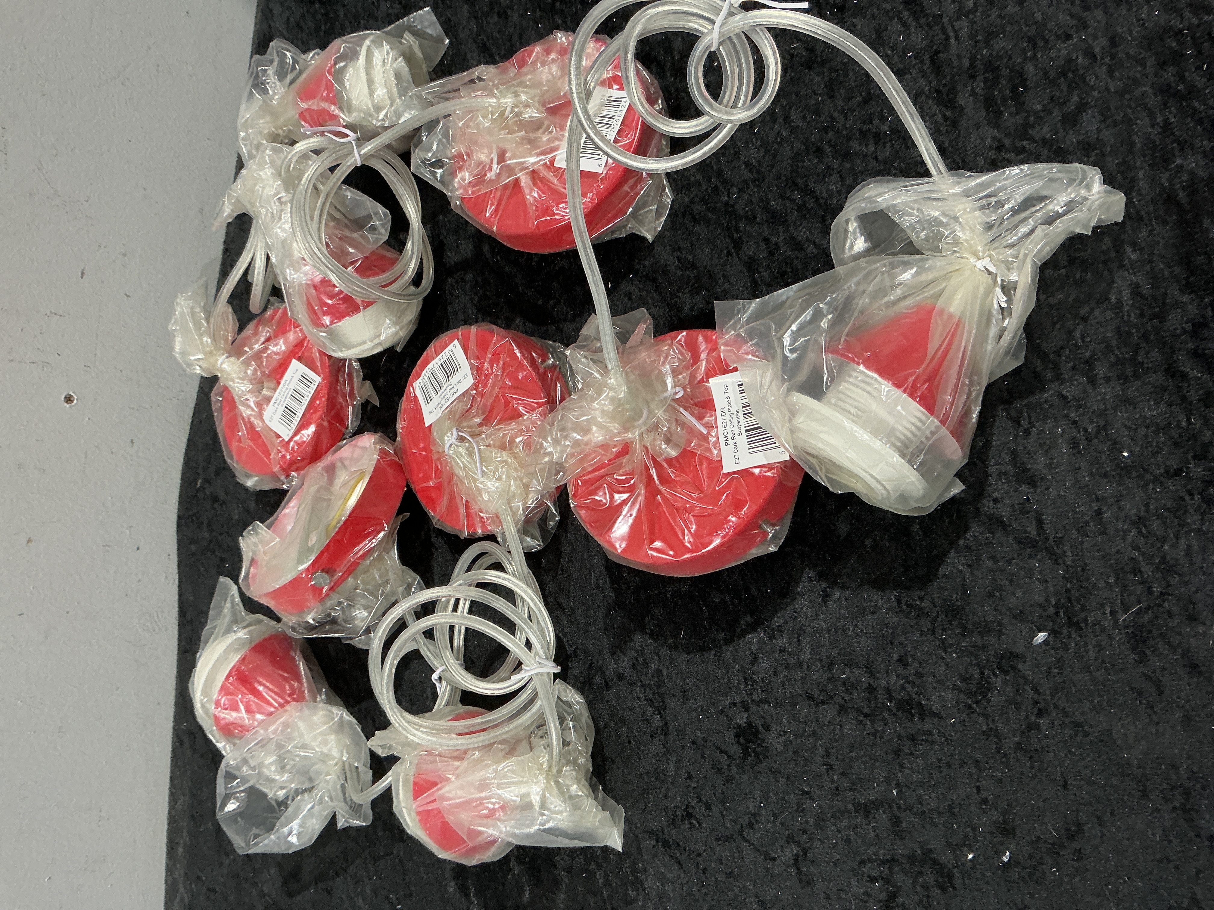 A collection of forty-seven modern lighting suspension kits, each individually factory-packaged. Each kit includes a circular dark red ceiling plate or canopy component, likely constructed from plastic or painted metal, and a white interior electrical component designed for an E27 socket housing. The kits feature coiled clear plastic sheathed electrical cable secured with a white tie. Visible labeling on the packaging identifies the product type and model number as PMC1E27/DR E27 Dark Red Ceiling Plate & Top Suspension.