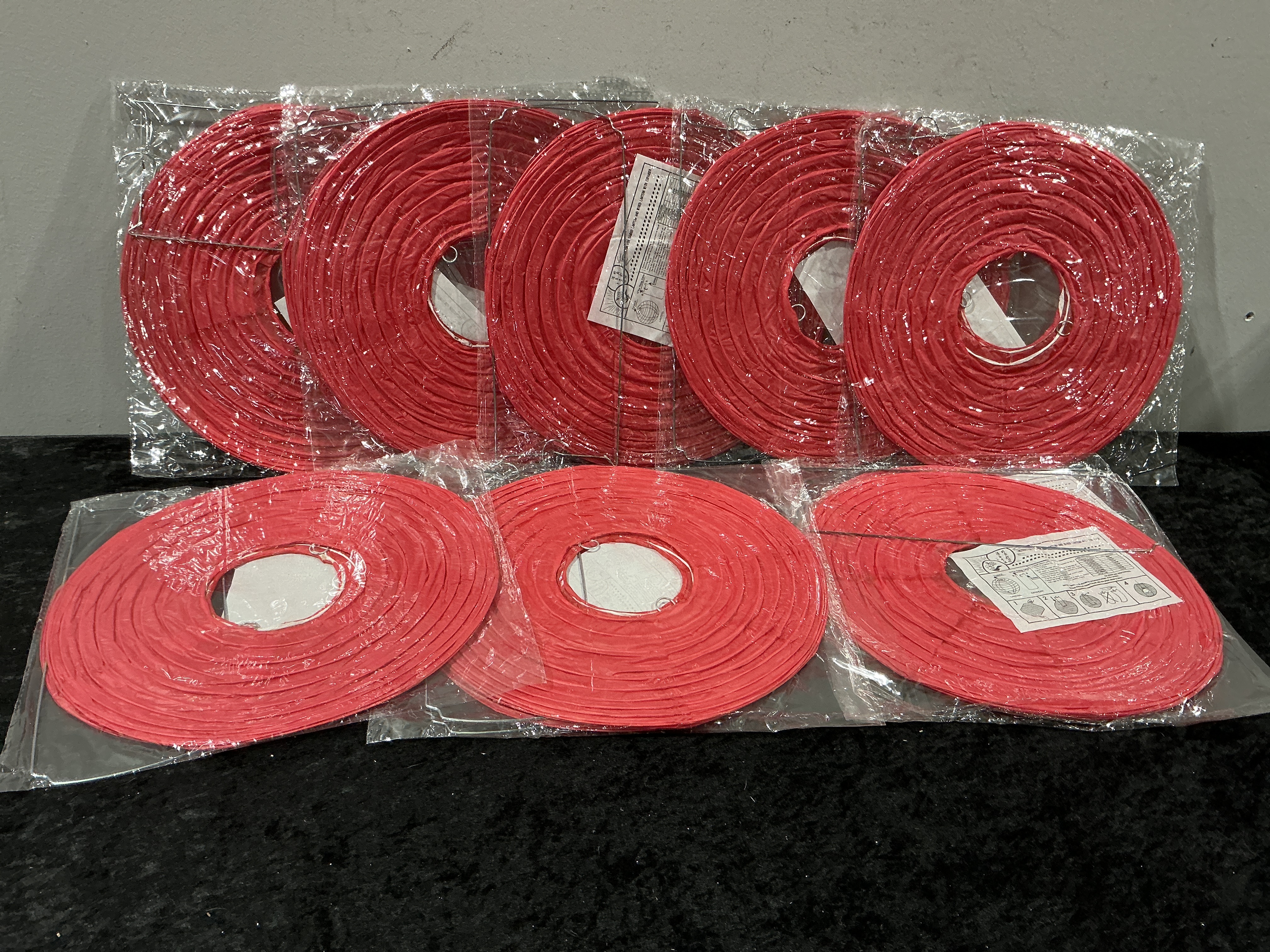 A large collection of 100 red paper lantern light shades, suitable for hanging decorative use at festivals, weddings, or parties. Each lantern is constructed of bright red pleated paper or thin fabric, compressed into a flat, circular disk configuration for storage. The items include internal metal wire supports and hangers necessary for assembly. Each lantern is individually sealed in clear plastic packaging. Visible instruction sheets inside the packaging identify the item generically as a “PAPER AND WIRED LANTERN.”