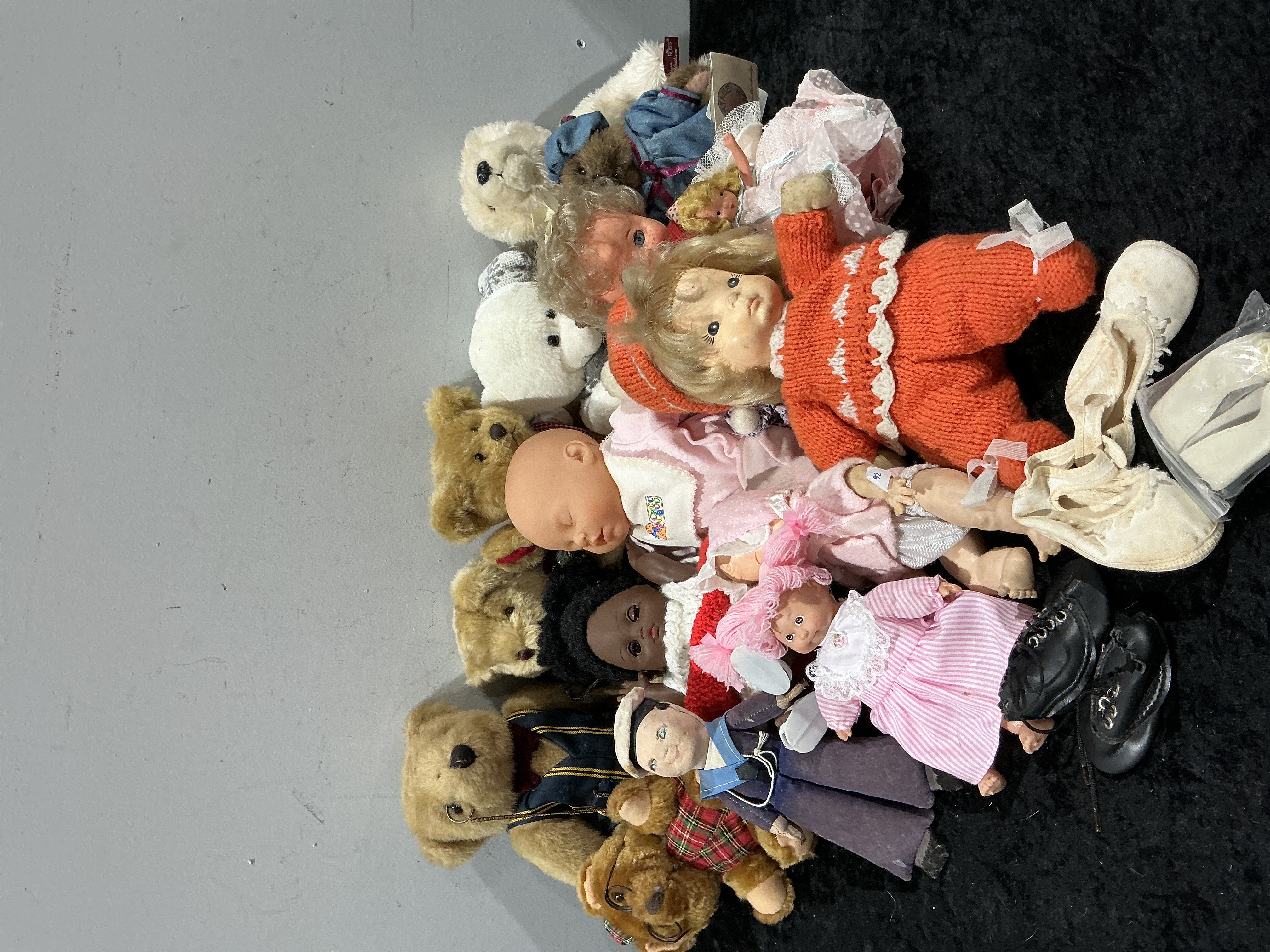 A large collection of 18 items consisting of assorted dolls, plush toys, and doll footwear accessories. The lot includes approximately 15 dolls and plush figures constructed from materials such as vinyl, plastic, and various textiles. Dolls depict infants, toddlers, and a cloth-bodied sailor figure. One baby doll features a bib marked CHOU CHOU. The plush toys include several teddy bears, notably one wearing a waistcoat and monocle, and several white plush animals. One plush bear retains a visible tag identifying it as a RUSS product. Accessories include a pair of black lace-up shoes, a pair of soiled cream fabric slippers, and an additional pair of white fabric footwear sealed in a plastic bag. The collection represents mixed styles and eras.