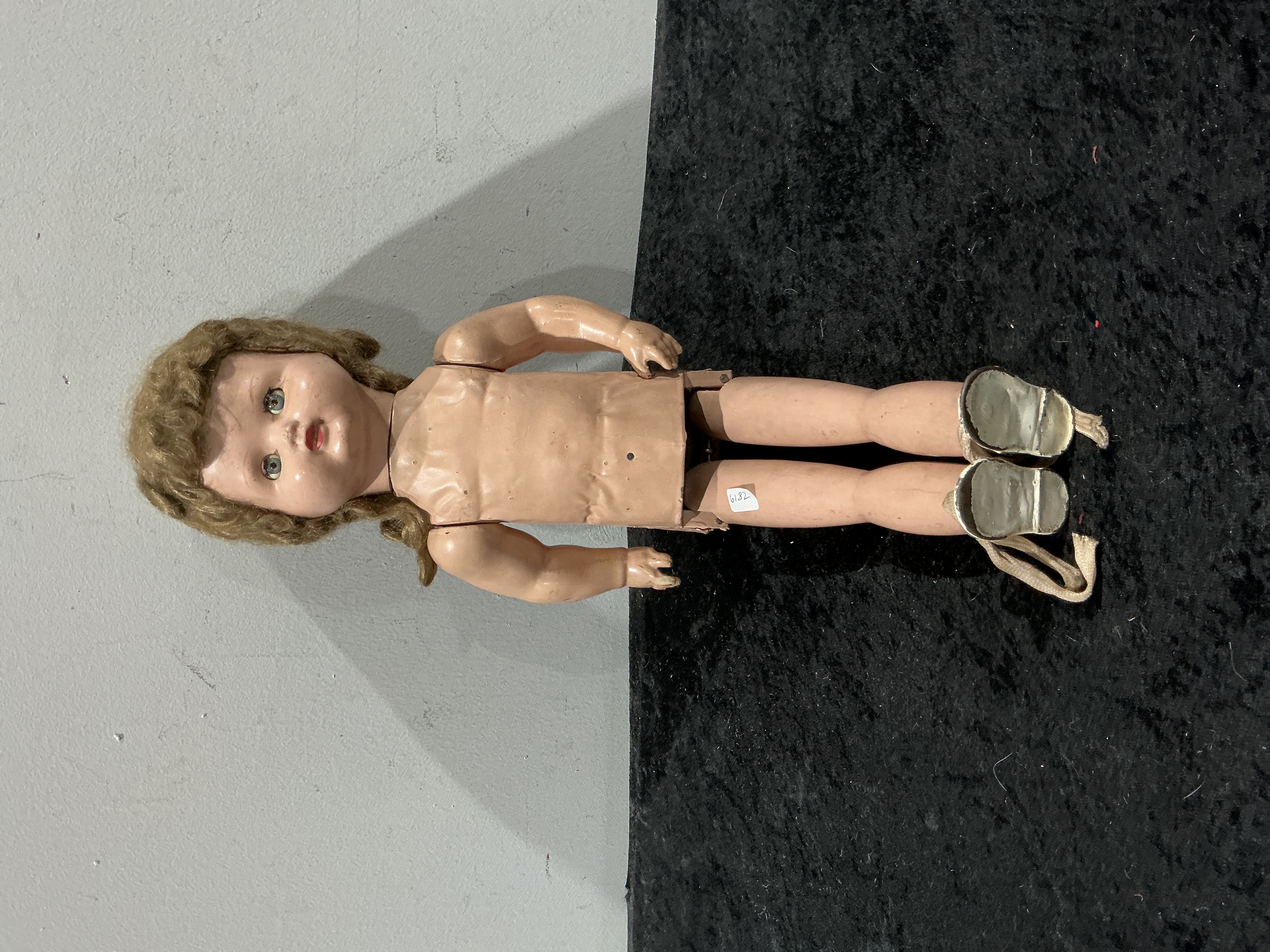 A single vintage composition head doll identified through visual and market consensus as an Ideal Composition Shirley Temple model, likely dating from the 1930s or 1940s. The doll is constructed of composition or hard plastic material, featuring a molded body and head. The face displays painted blue eyes, red lips, and molded or rooted light brown synthetic hair styled in ringlets. The doll is jointed at the shoulders and hips, with the joints visibly secured by string or metal hooks. The doll is largely undressed, retaining only a dark undergarment visible at the waist and simple white painted shoes secured by tan fabric strips or ties around the ankles. A rectangular white inventory sticker marked 6182 is affixed to the inner right thigh.