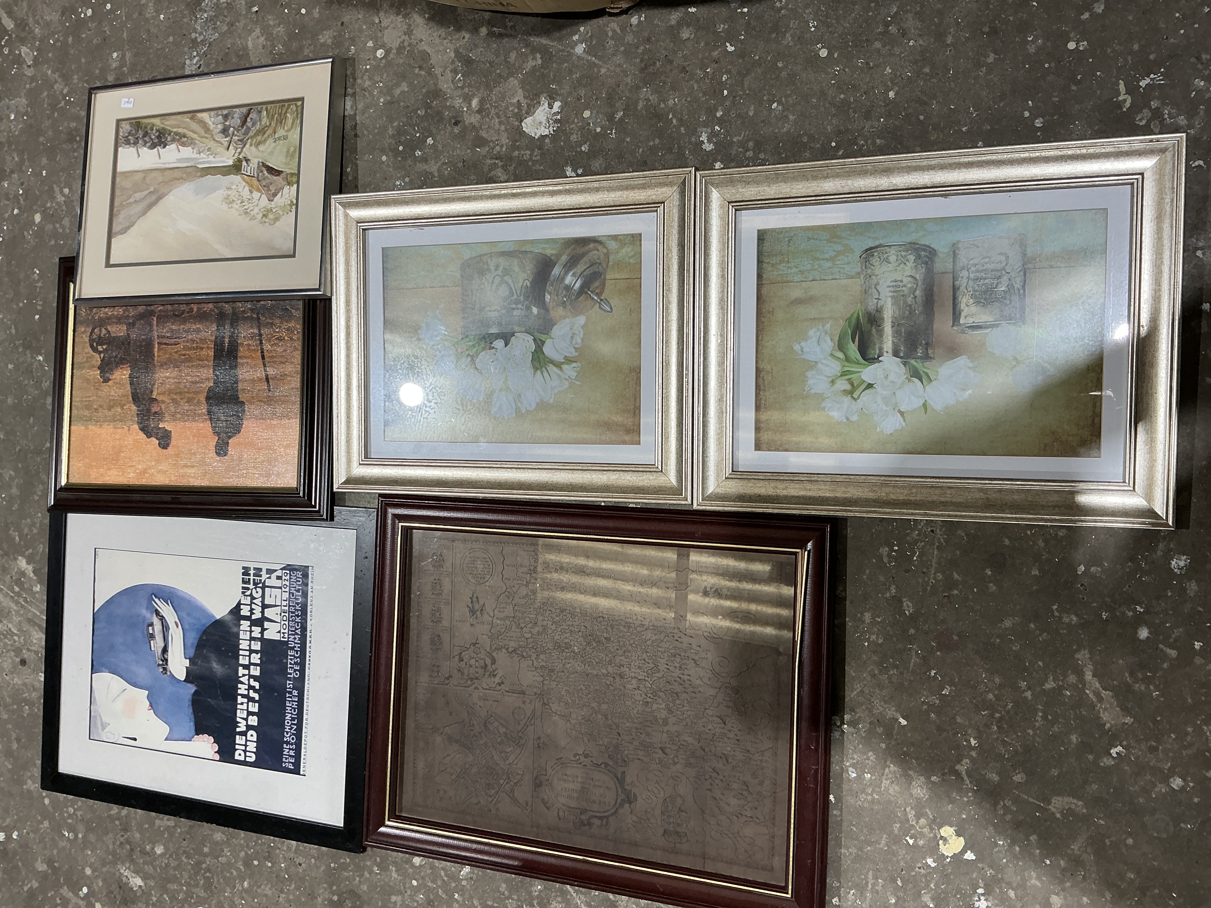 A collection of six framed artworks spanning various styles and periods. The lot includes a large framed print reproduction of an Art Deco-style advertisement featuring a woman and a classic car, bearing the German text, “DIE WELT HAT EINEN NEUEN UND BESSEREN WAGEN” (The world has a new and better car), housed in a black frame. Also present is a smaller print depicting dark silhouettes against an abstract background, framed in dark wood. A third item is a matted landscape print or watercolor depicting a rocky riverside scene. The second row includes a large print reproduction of an antique map or fortified city plan, heavily toned and obscured, housed in a wide burgundy frame. Completing the collection is a matched pair of decorative still life prints depicting white flowers in metallic vessels, framed in modern, textured champagne-colored composite frames. All items are framed under glass or acrylic.