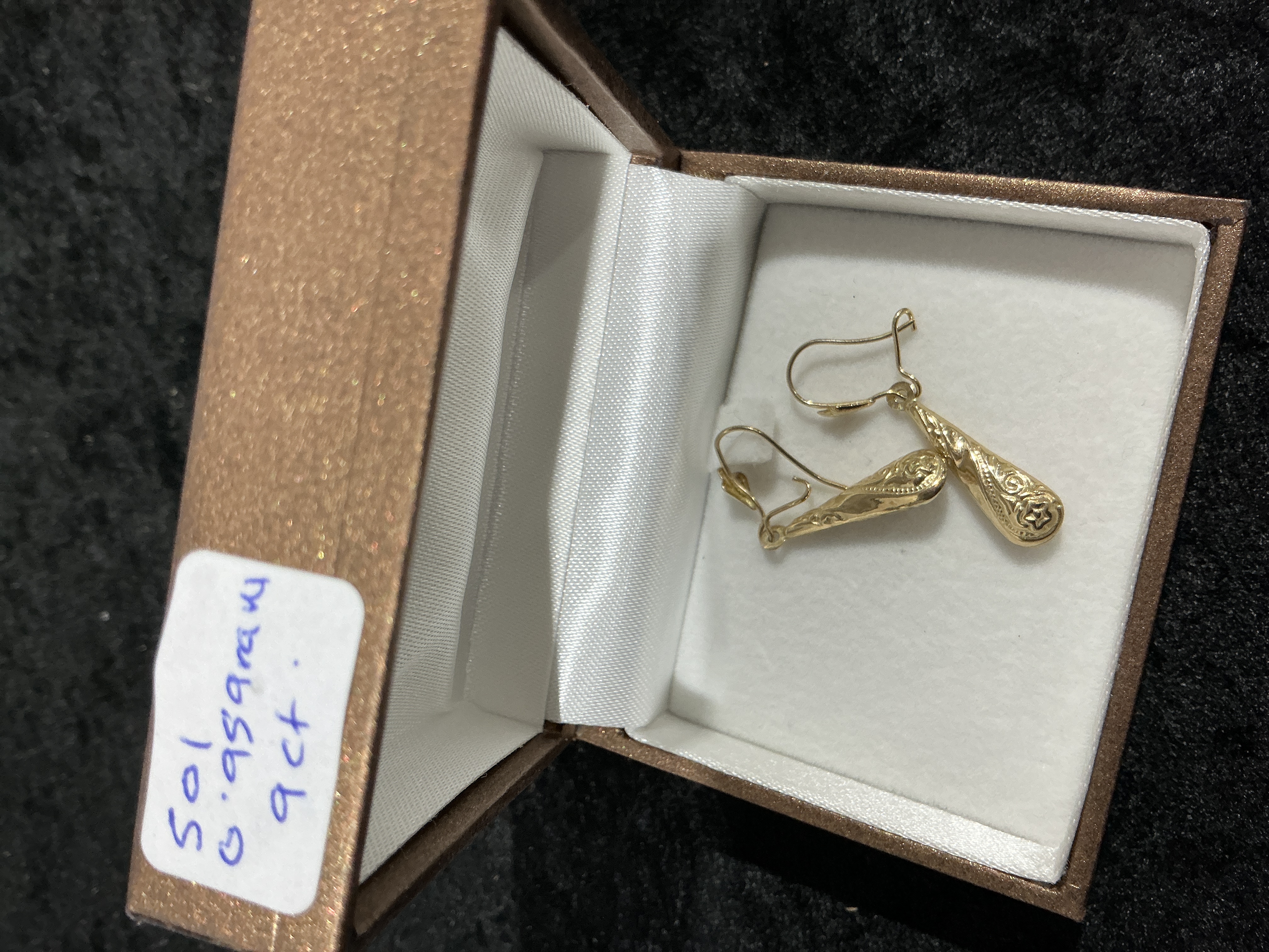 A pair of drop earrings confirmed to be crafted from 9ct gold. Each earring features an elongated teardrop or torpedo-style body suspended from a French wire closure, which includes an integrated safety keeper. The body of the earring is decorated with intricate stamped or engraved scrollwork, culminating in a small central star motif at the base. The style is consistent with revival or traditional patterned yellow gold jewelry. The items are presented in a copper-colored presentation box with a white satin lining. A handwritten inventory label affixed to the box lid provides specifications, including the inventory number 501, the material confirmation of 9ct, and the weight.