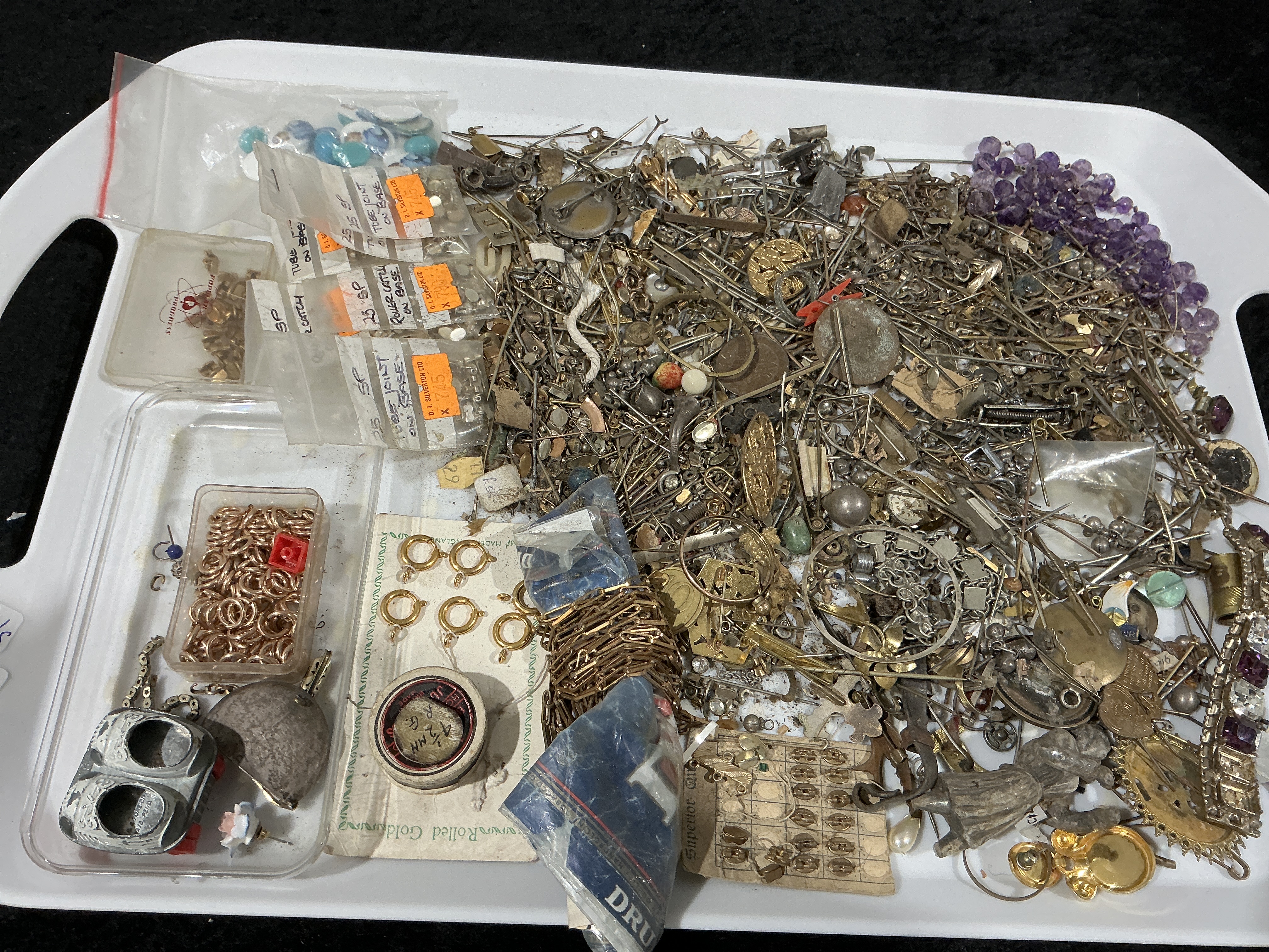 This lot constitutes a substantial collection of mixed metal ware items, components, and findings intended for spares and repair. The collection includes a large central pile of salvaged costume jewelry scrap, pins, broken chains, and miscellaneous components in silver-tone, gold-tone, and copper-tone base metals. The lot is organized into 15 distinct groups and containers. Specific components include five small plastic zip bags containing findings marked with vendor details D. I. SILVERTON LTD and descriptions such as TUBE JOINT ON BASE and quantity counts (e.g., 25 SP). Also present are a clear tub of rose gold-tone jump rings; a strand of faceted purple glass or synthetic beads; and a card mounted with four gold-tone spring ring clasps labeled Rolled Gold and Made in England. Further packaged items include a small round box marked 1/20 R. G. 4 MM and a small card of attached components labeled Superior Quality. The collection also contains a container of gold-tone chains and two large loose pendants, one heart-shaped and one stylized mechanical design. The materials are consistent with mixed-period costume jewelry components, presented primarily as a spares and repair tray of metal ware items etc.