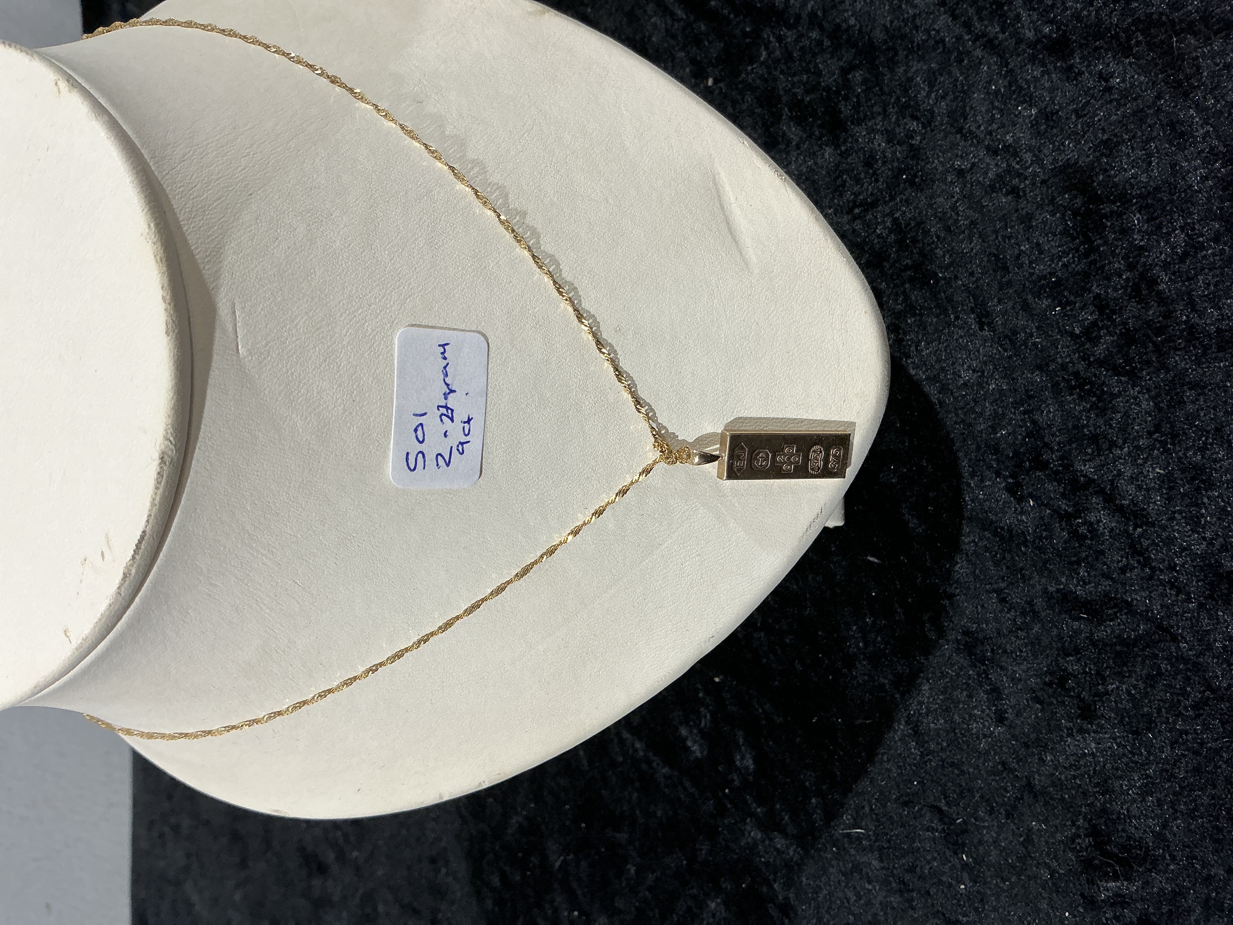 A 9ct gold necklace featuring a twisted chain supporting a rectangular Ingot pendant. The pendant is designed to resemble a gold bullion bar and is heavily hallmarked on its face. The construction is consistent with modern jewelry manufacture. Visible hallmarks on the pendant include the maker’s initials EJ, a series of geometric and assay symbols, and multiple fineness markings including N375A and 375, confirming the 9ct gold standard. The piece is presented with a polished yellow finish. The lot includes the necklace and an accompanying handwritten tag noting the item number and weight.