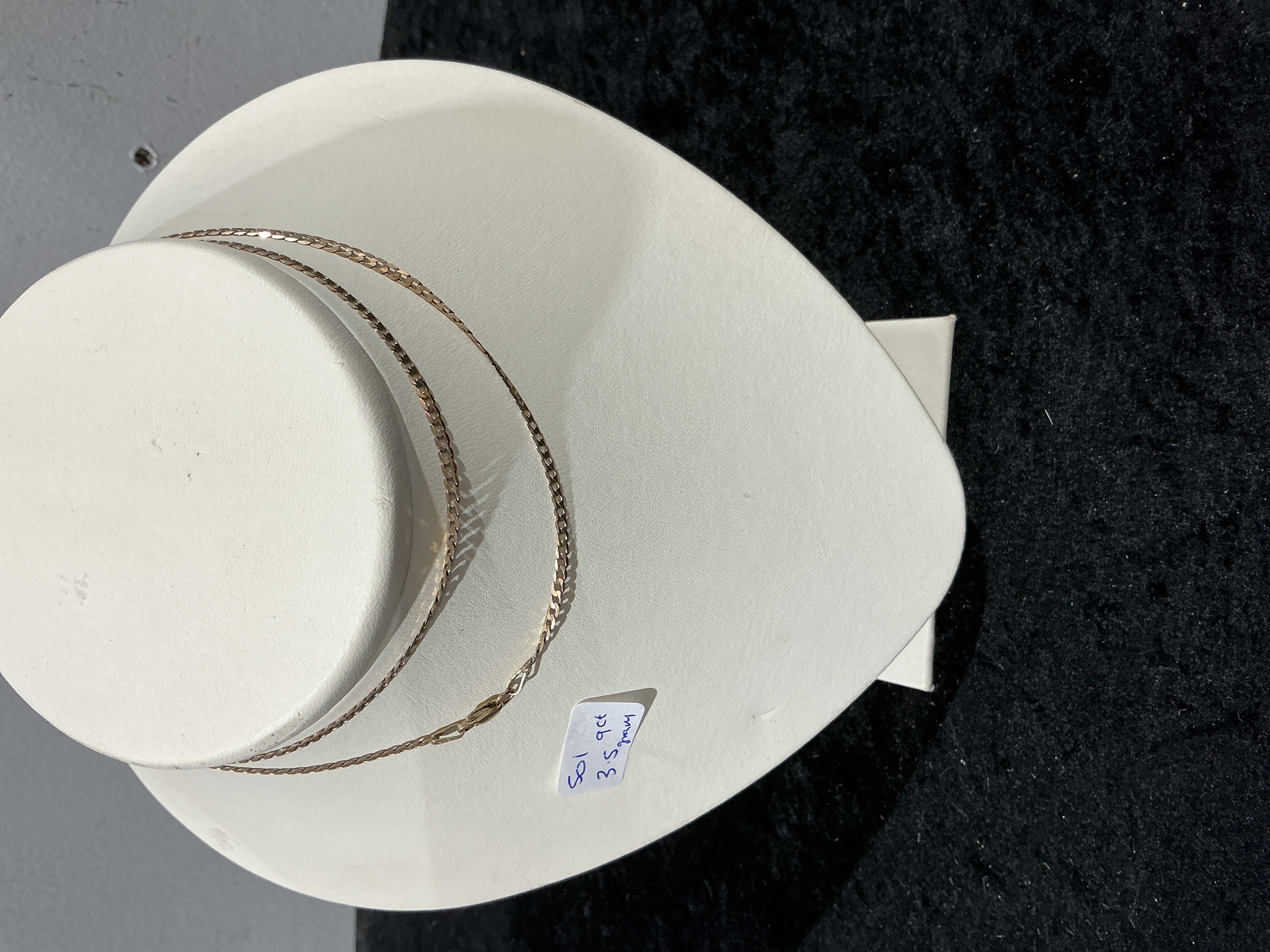 A pair of 9ct gold necklaces, both constructed with thin, flattened, interlocking links consistent with the curb chain style. Market research suggests these styles are often described as diamond cut curb chains. The chains exhibit a yellow or rose gold tone. One chain features a visible lobster claw clasp closure. The lot is identified by an affixed label indicating a total weight of 3.5 grams and a composition of 9ct gold.