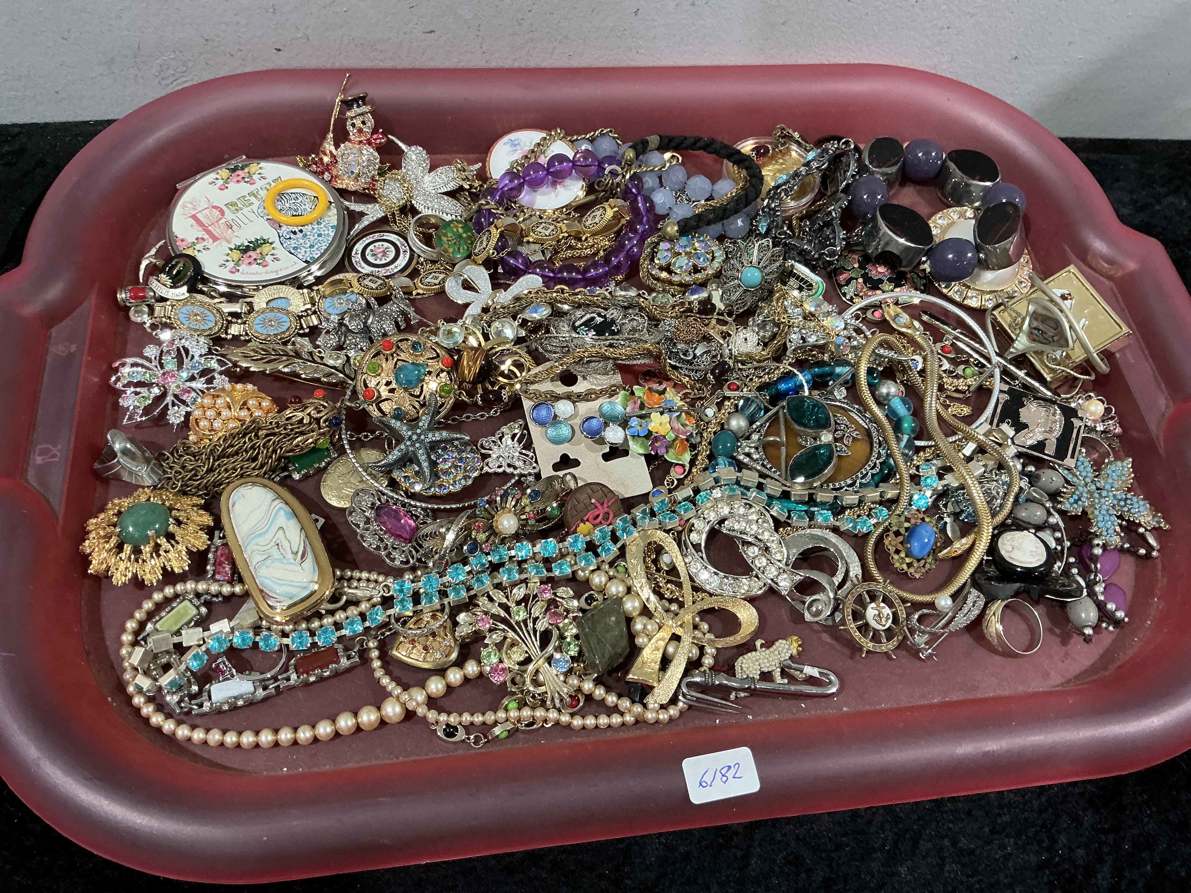 This collection comprises 52 individual items of mixed costume jewelry and one accessory, contained within a reddish-pink plastic tray marked internally with the handwritten number 6182. The lot spans various periods, from mid-century vintage styles to more contemporary pieces, and is consistent with lots marketed for craft or scrap use. Materials utilized include gold-tone and silver-tone base metals, faux pearls, colored rhinestones (clear, pink, blue, green), plastic beads, and enamel. The collection features a wide variety of forms including necklaces (faux pearl strands, snake chains, beaded), bracelets (chunky plastic, braided cord, link), rings, and numerous brooches and pins. Notable figural designs include a rhinestone-set snowman, a lion, a starfish, and an Egyptian-themed profile pin. The accessory item is a circular compact mirror marked “PRETTY POLLY.” The assortment is tangled and unsorted.