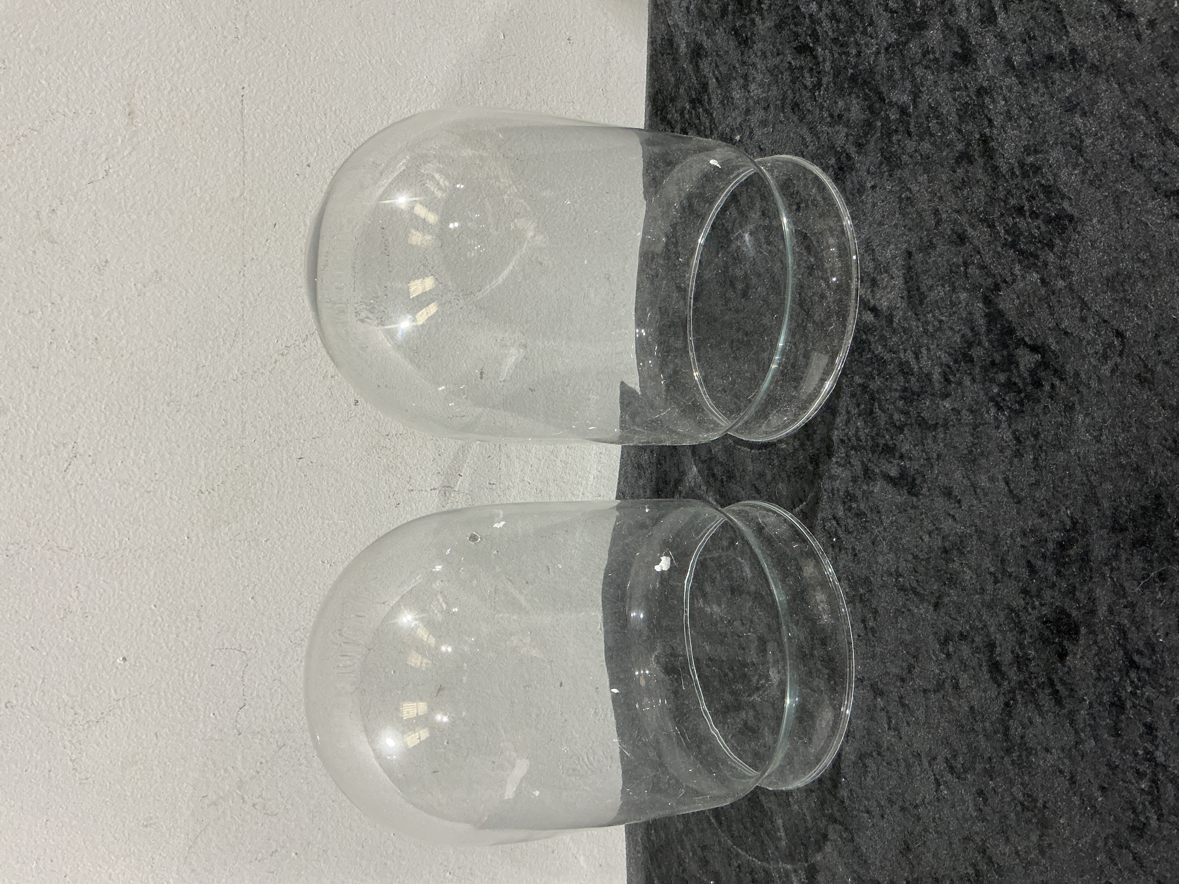 A collection of ten clear glass display cloches or lamp shades. Each piece is formed from transparent, colorless glass, exhibiting characteristics consistent with handmade or hand-blown construction. The form features a traditional hemispherical dome top transitioning to straight sides, terminating in a low, subtly flared base rim. These items are versatile, suitable for use as display domes, terrariums, or replacement light shades. No manufacturer markings, stamps, or inscriptions are visible on any piece.