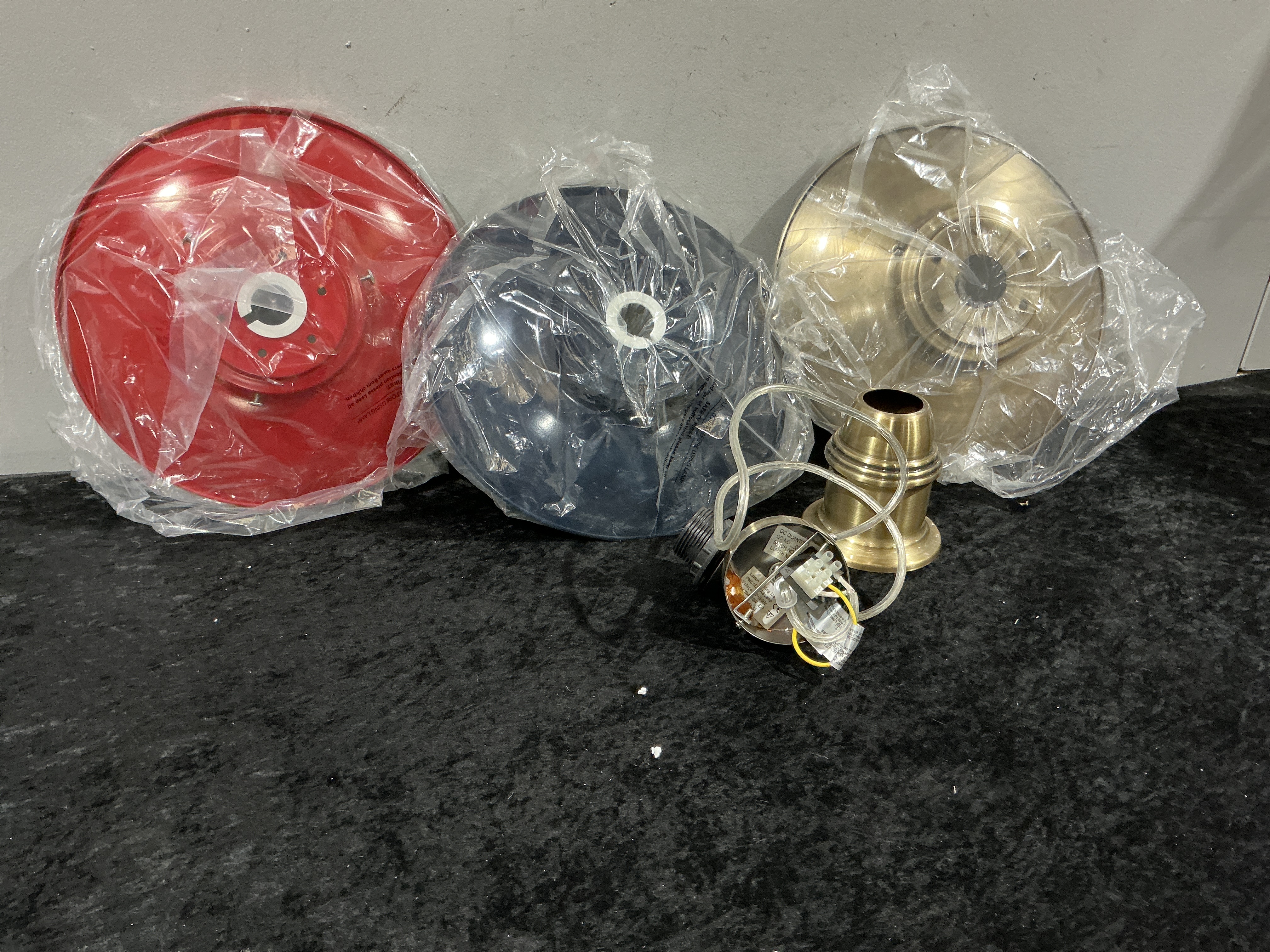 A collection of five modern lighting fixture components, comprising three deep, bowl-shaped pendant shades and two associated brass-toned hardware fittings. The shades include one finished in glossy red enamel, one finished in navy blue enamel, and one polished brass or gold-toned metal shade. These light fittings appear designed for a modern or contemporary interior. The accompanying hardware includes a brass-toned cylindrical canopy/socket holder and a small electrical assembly featuring an LED lamp unit with visible wiring and terminal blocks. The electrical assembly displays manufacturer markings including “CE” and “QC QUANTITY.”