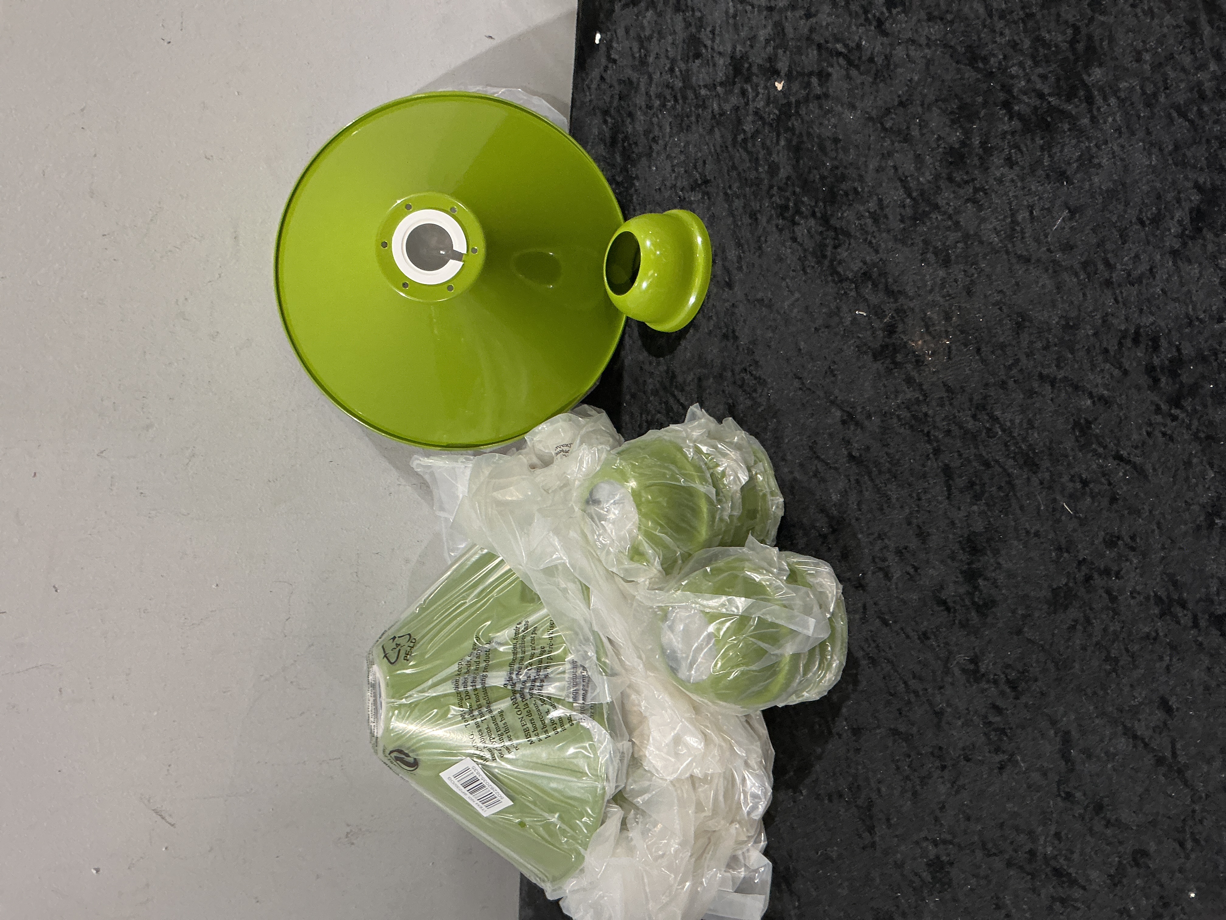 A collection of 12 contemporary lighting components designed in a modern or industrial style. The components are constructed of metal and finished with a glossy, vibrant lime green enamel. The lot consists of 12 individual items, comprising various conical shades and associated fixture caps. Some components remain in their original protective plastic packaging, which bears a “PE-LD” recycling symbol and standard safety warnings in English and French. One packaged stack of conical shades includes a sticker marked “ITEM NO. SF6200G” and an associated barcode.