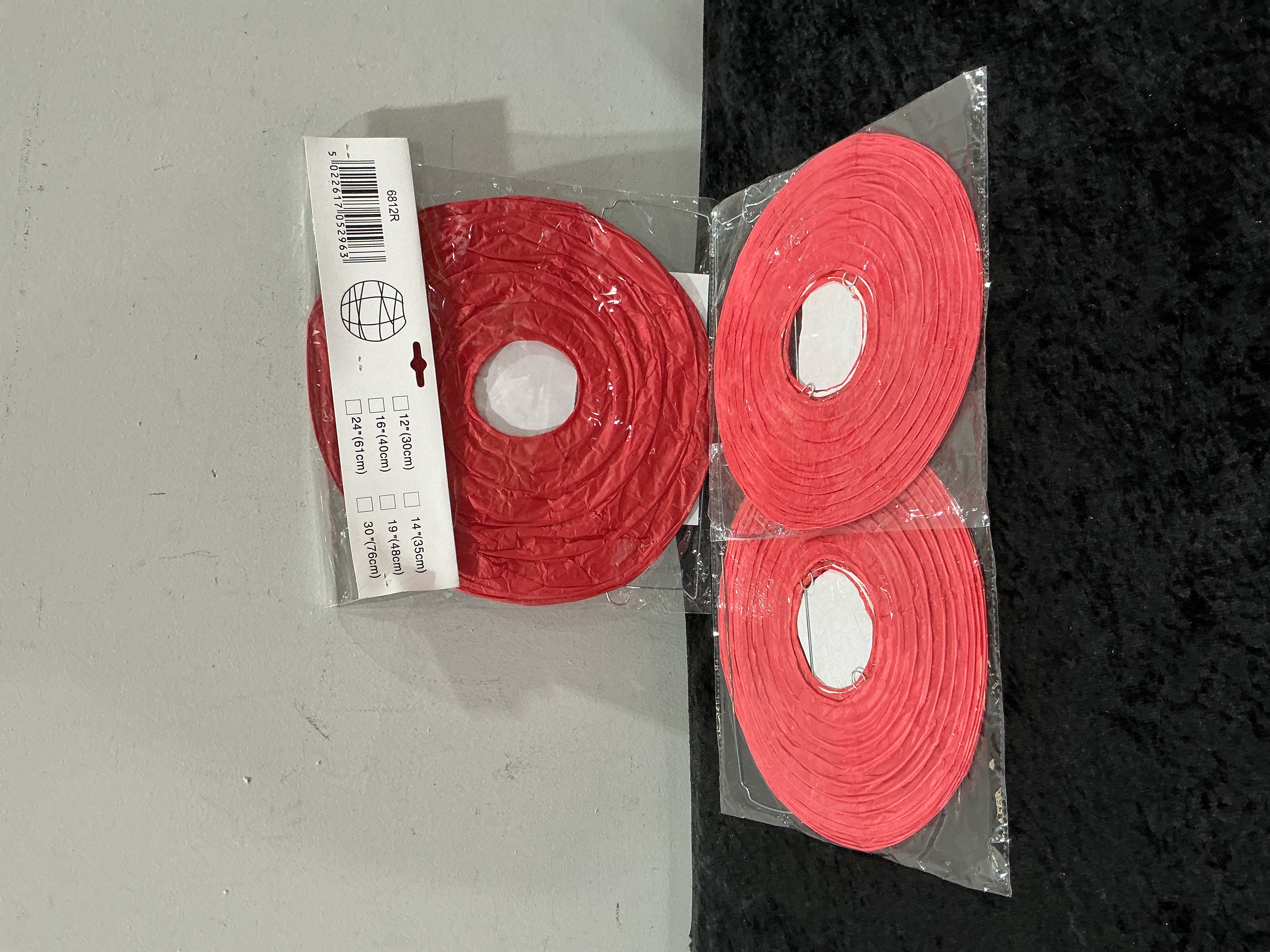 A collection of 100 new and unused red paper lantern light shades, designed in a traditional round, collapsible style suitable for decorative use at parties, weddings, or festivals. The lanterns are constructed from pleated red paper with internal wire supports allowing them to fold flat for storage and retail display. The lot is comprised of 100 individual items, consistent with bulk retail stock. The packaging visible on the sample items features product code 6812R and a barcode beginning 5022617. The packaging indicates potential size options ranging from 12 inches (30cm) up to 30 inches (76cm).