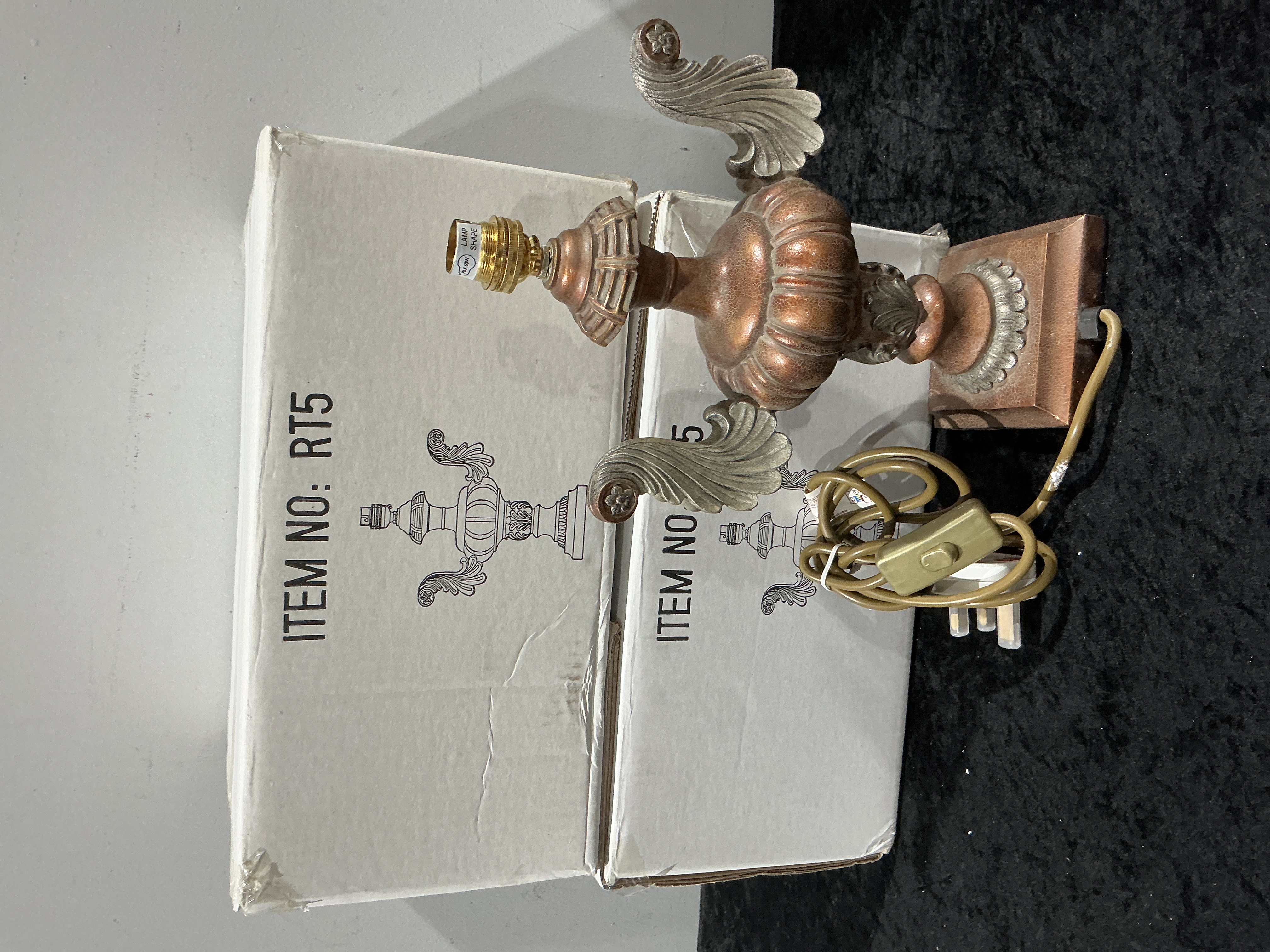 A pair of table lamp bases constructed from molded resin or composite material. The design is executed in a traditional winged urn or trophy style, featuring a textured finish intended to mimic oxidized copper or bronze. Decorative elements, including the scrolled winged handles and base details, are highlighted with a silver-toned finish. One lamp base is unpacked, and the second is contained within its original cardboard box. The packaging is marked “ITEM NO: RT5” and includes a line drawing illustrating the lamp design. The electrical fitting includes a brass-toned E27/ES socket marked “MAX 60W LAMP SHAPE,” connected to a brown electrical cord with an inline switch and a UK-style three-pin plug.