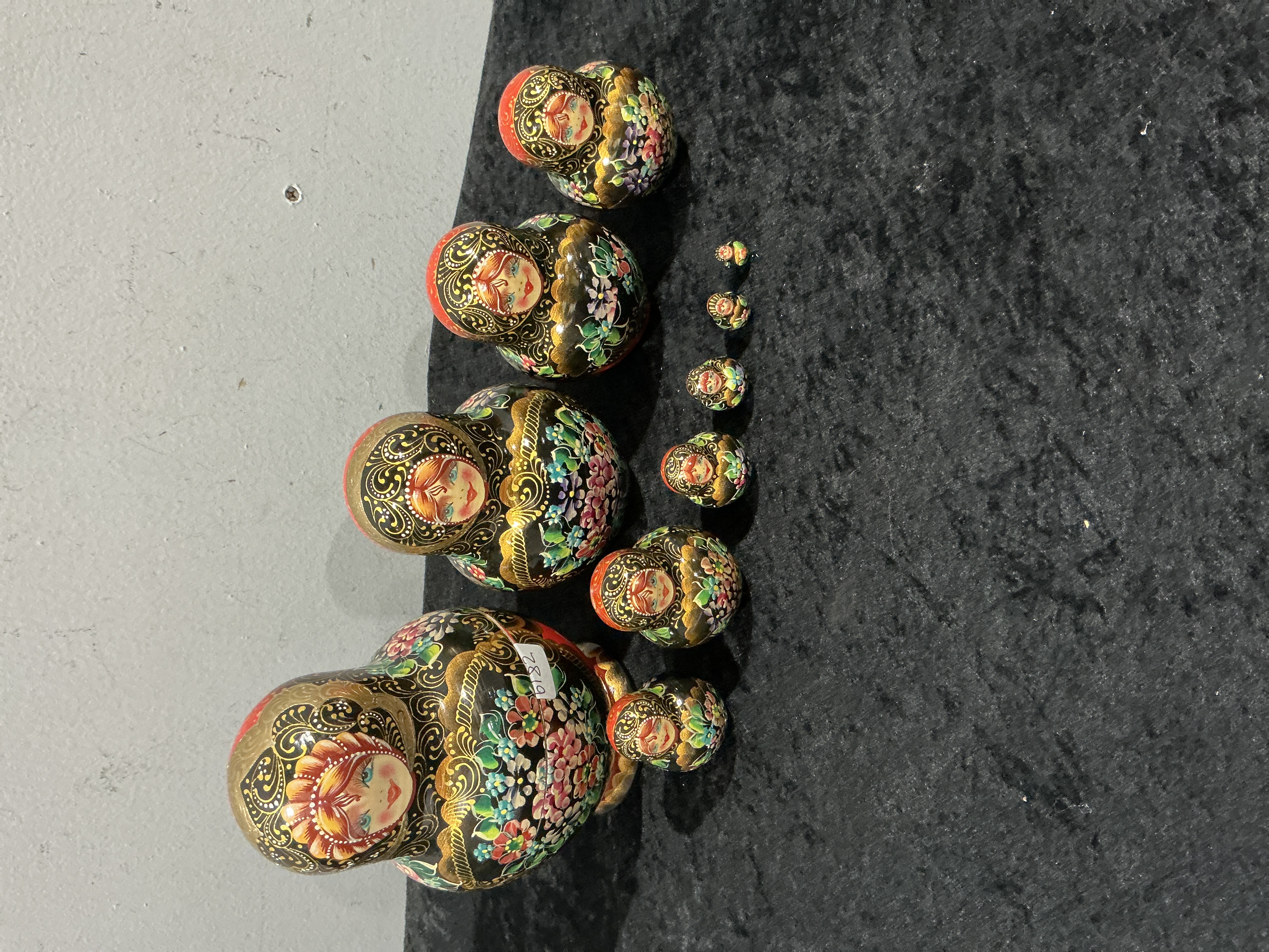 A Collection of 10 Vintage Russian Matryoshka Nesting Dolls Hand Painted Black and Gold Floral Pattern