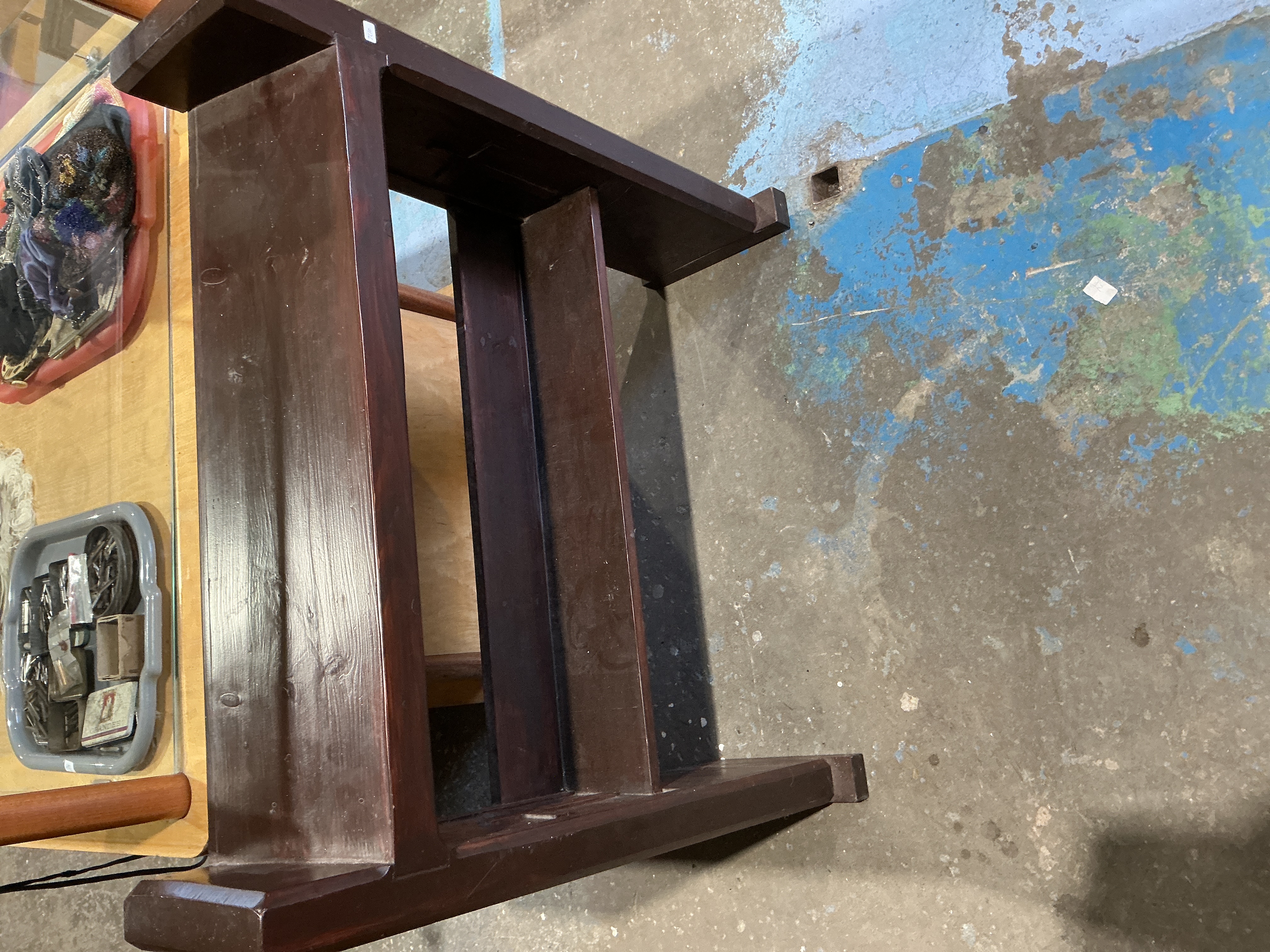 A utilitarian two-tiered display stand or small bookshelf unit constructed of solid wood planks. The item is finished in a deep reddish-brown stain. The structure features two horizontal shelves supported by thick side panels. The side panels extend above the top shelf, which slopes gently upward towards the rear. The simple, robust construction suggests use as a library display, retail fixture, or small storage unit. A small white label or sticker is visible on the upper right side panel.