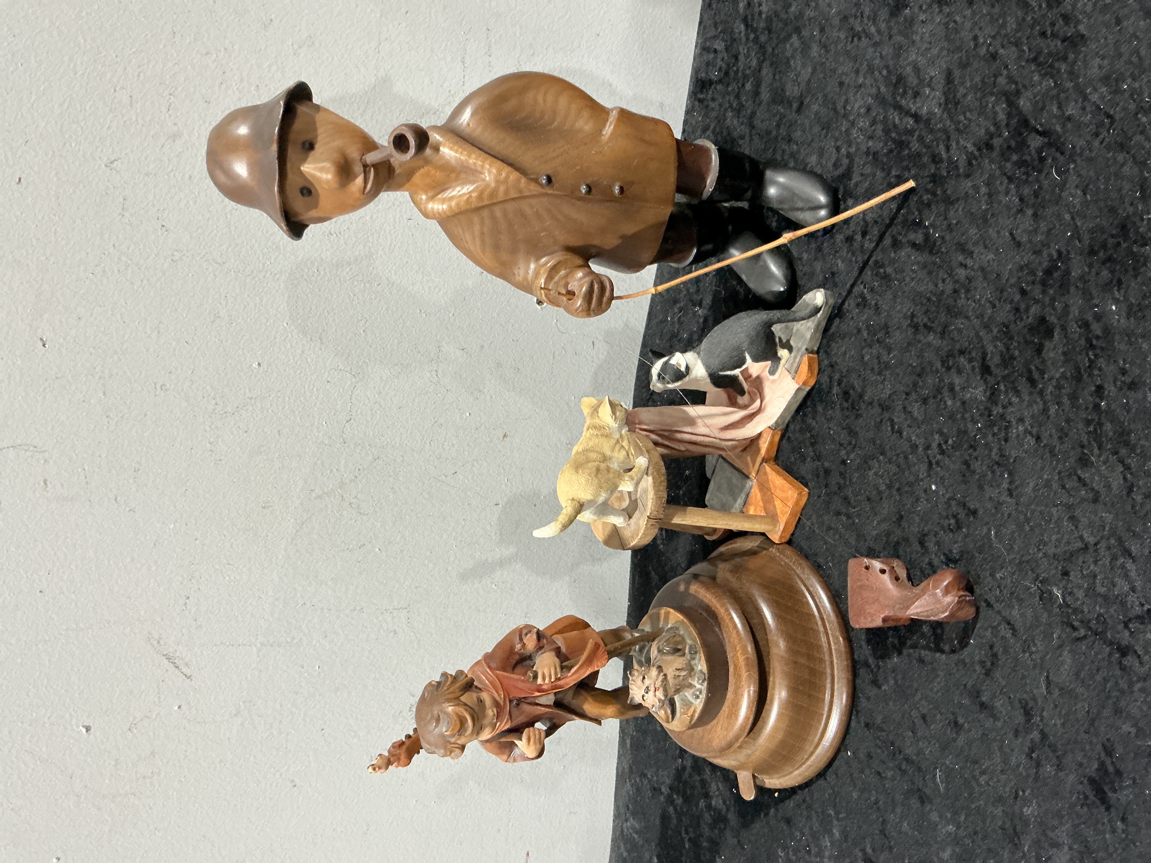 A collection of four vintage hand-carved and polychrome-painted wooden folk art figures, likely of Central European or Italian origin, executed in a traditional style. The lot includes four distinct items. The primary piece is a large figure of a man, identified in the market as a Duck Hunter, wearing a coat with a fur collar and a round hat, featuring a carved pipe in his mouth and holding a thin wooden rod. His boots are painted black. The second item is a figure of a young boy in a coat and scarf, standing atop a tiered circular wooden base. This base incorporates a small carved dog and features a pull tab, suggesting the item functions as a mechanical device, such as a music box. The third item is a small diorama depicting two cats (one tan, one black and white) interacting around a small wooden stool and draped fabric, set on a tiled base. The fourth item is a small, separate, dark carved wooden fragment. The carvings exhibit natural wood tones accented by areas of paint on clothing and details.