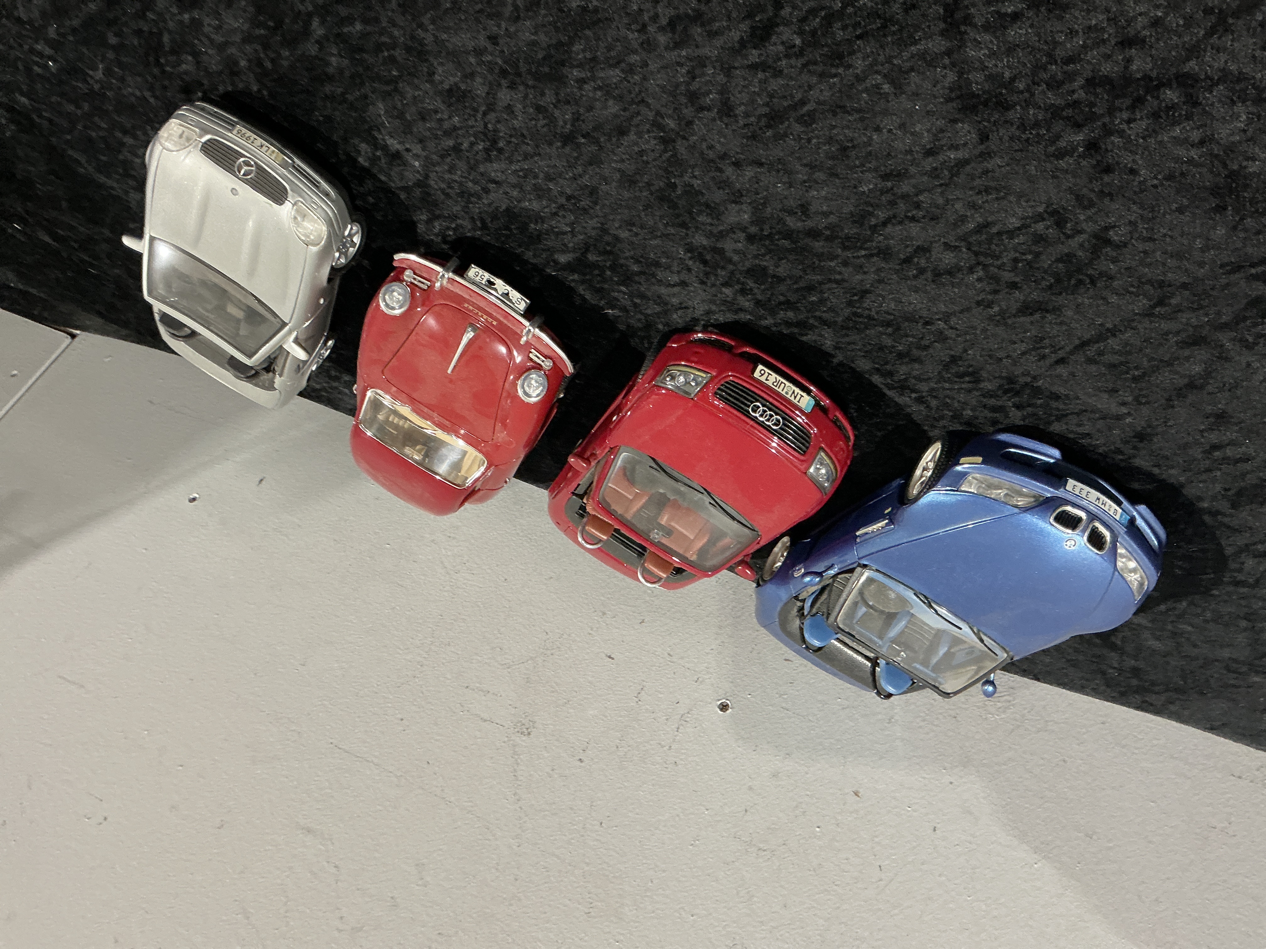 A collection of four die-cast scale model collectible cars, featuring detailed construction primarily of die-cast metal bodies with plastic components used for interiors, windshields, and smaller details. The lot comprises four distinct German sports car and roadster models. The vehicles include a blue BMW convertible (likely a Z3 model), a red Audi TT convertible, a red classic Porsche roadster (resembling a 356 type), and a silver Mercedes-Benz SLK roadster. All models are finished with high-gloss paint and feature custom replica license plates referencing German registration formats. Visible license plate markings are: the BMW reads “B MW 333,” the Audi reads “IN UR 16,” the Porsche reads “S-** 56,” and the Mercedes-Benz reads “S LK 1998.” The scale appears to be larger, consistent with detailed collector models.