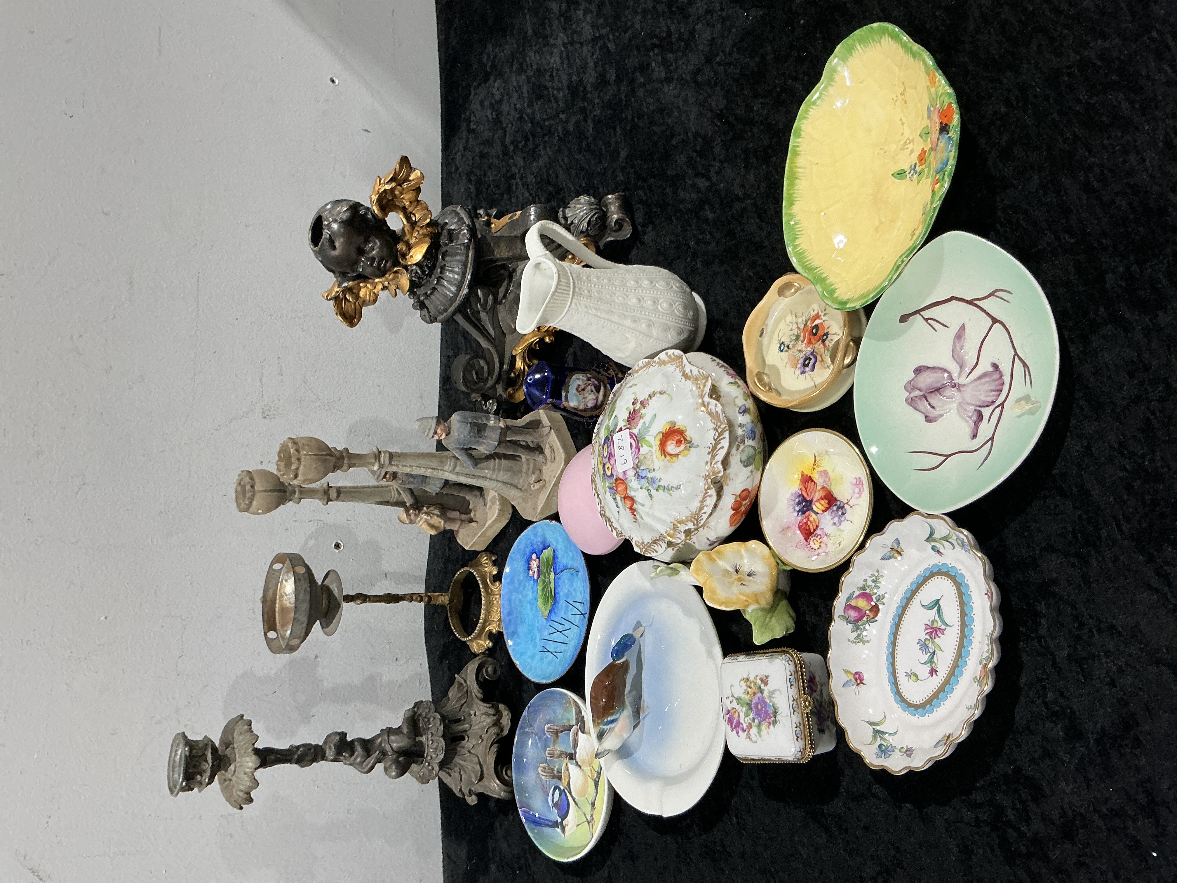 A collection of 18 miscellaneous decorative objects composed primarily of porcelain, various ceramics, and patinated metal. The metalware includes three disparate candle holders or stands: an ornate dark metal candlestick, a small gilt metal stand, and a figural piece featuring a dark, patinated cherub head with gilt wings set on a bronze base. Also present is a composite figural piece depicting two standing men beside posts, serving as a probable lamp or candelabra base. The ceramic items vary widely, including a prominent large, circular porcelain covered box decorated profusely with painted floral sprays and gilt detailing, bearing a white sticker marked 6182. The lot also contains a number of small dishes and plates with scalloped edges and hand-painted motifs, including floral, berry, and bird scenes. Notable ceramic pieces include a white plate with a centered ceramic duck figurine, a white pitcher with molded relief decoration, and a small dark blue ceramic vase. One small blue dish features the Roman numeral markings XIX/XVI. Other items include a small square porcelain box with a metal hinge, a small figural yellow flower or pear shape, and a pink egg-shaped object.