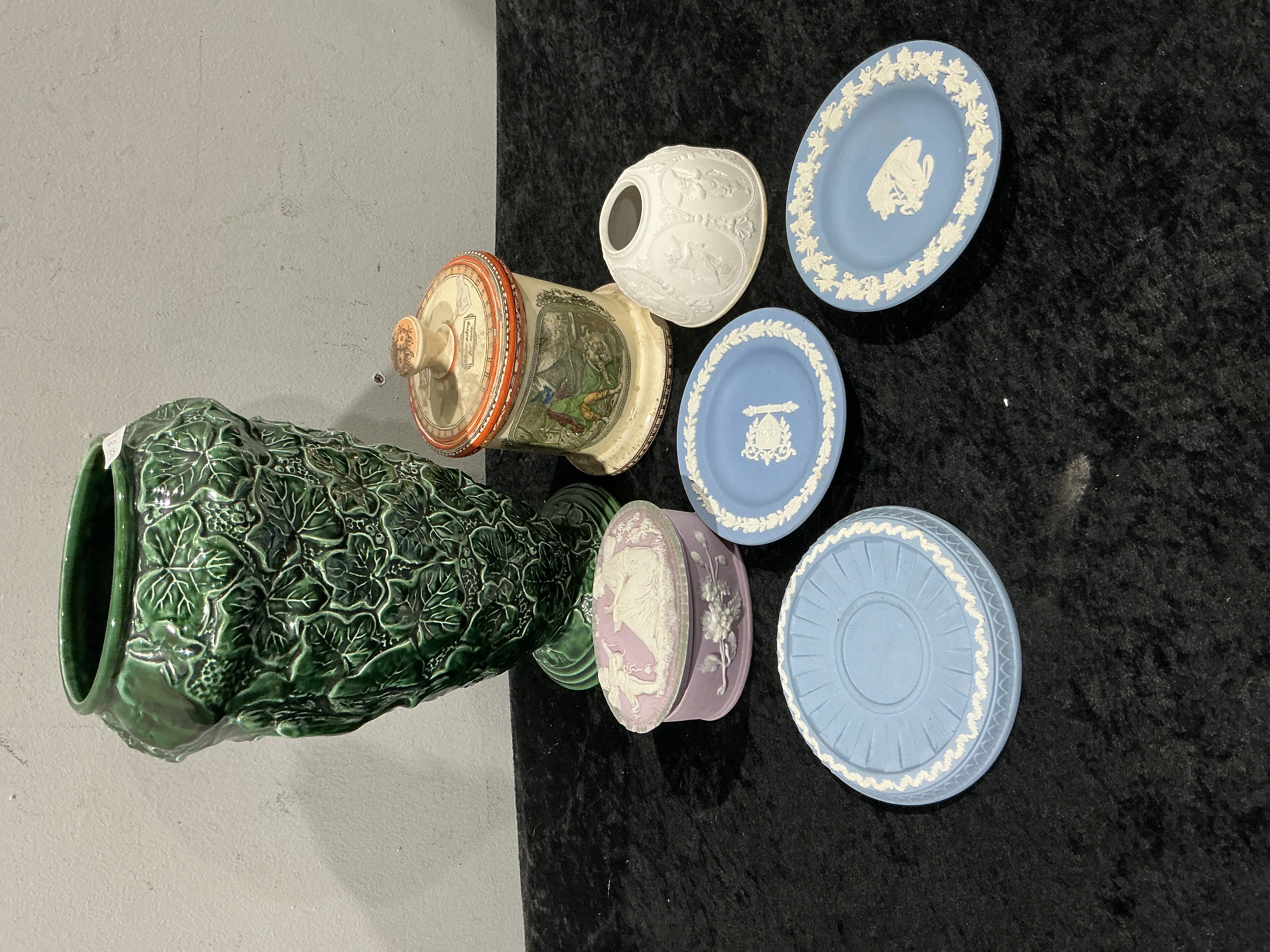 A collection of seven items of decorative ceramics and earthenware, consistent with mid-20th-century production. The centerpiece is a large green glazed earthenware vase, heavily modeled with high relief ivy and vine leaves across the body. The base of the vase features impressed black markings reading 2645, SYLVAC, and MADE IN ENGLAND. The collection also includes four items executed in the matte, biscuit-fired style of jasperware, comprising an oval lilac-pink box with white classical relief figures on the lid, two light blue saucers or small plates similarly decorated, and a plain, large light blue circular component. The remaining items consist of a cylindrical lidded jar decorated with colorful transfer prints depicting a figure in a kilt within a pastoral scene, and a small, white ceramic dome or miniature lamp shade molded with relief swags.