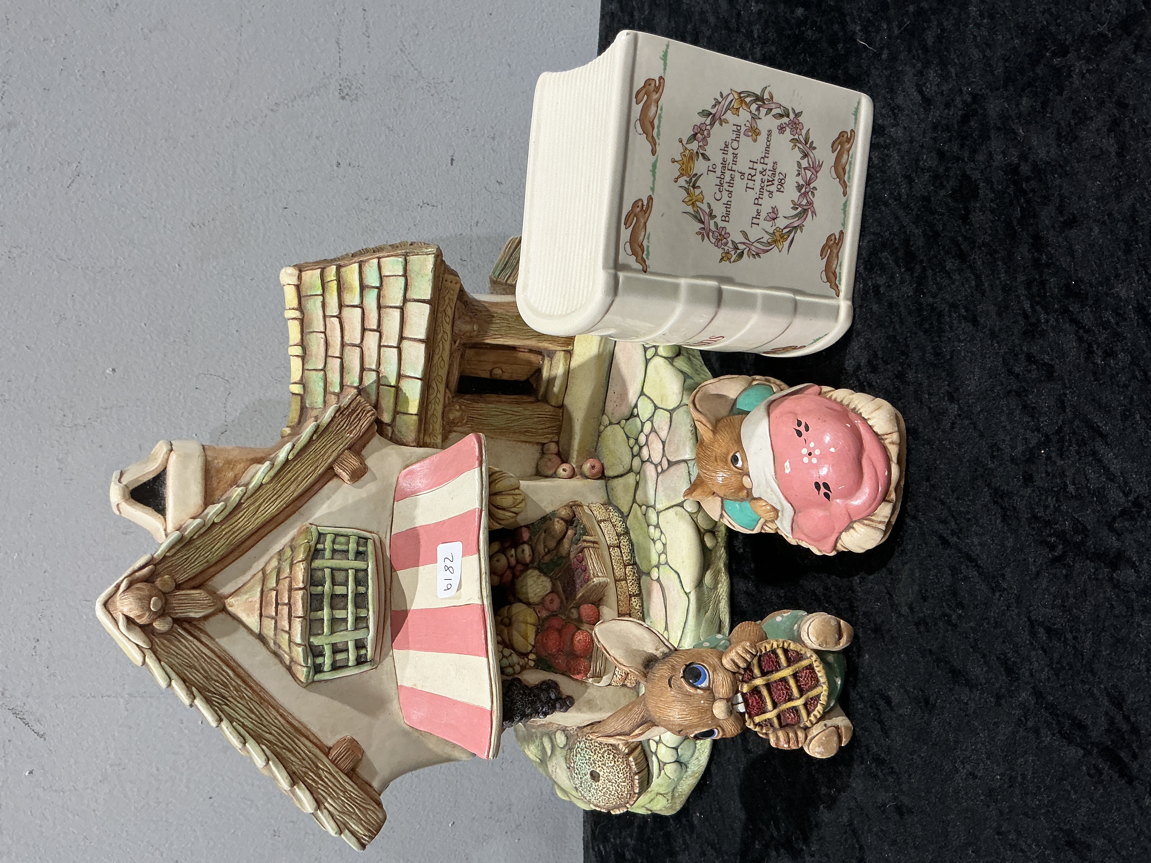 A collection of four glazed ceramic novelty figurines attributed to Royal Doulton Bunnykins. The lot includes a commemorative book-form money bank and three related anthropomorphic rabbit figurines and structures. The book bank is finished in white ceramic and features a detailed floral and rabbit decal surrounding the inscription: To Celebrate the Birth of the First Child of T.R.H. The Prince & Princess of Wales 1982. The collection also includes a large ceramic cottage or shop facade, detailed with textured stonework, a tiled roof, and a chimney, featuring a fruit stall visible under a pink and white striped awning. The third and fourth items are two smaller rabbit figurines: one depicting a rabbit holding a lattice pie, and the other showing a swaddled infant rabbit nestled in a basket. The pieces are executed in a colorful, late 20th-century style consistent with the Bunnykins line. A handwritten sticker reading 6182 is affixed to the awning of the cottage structure.