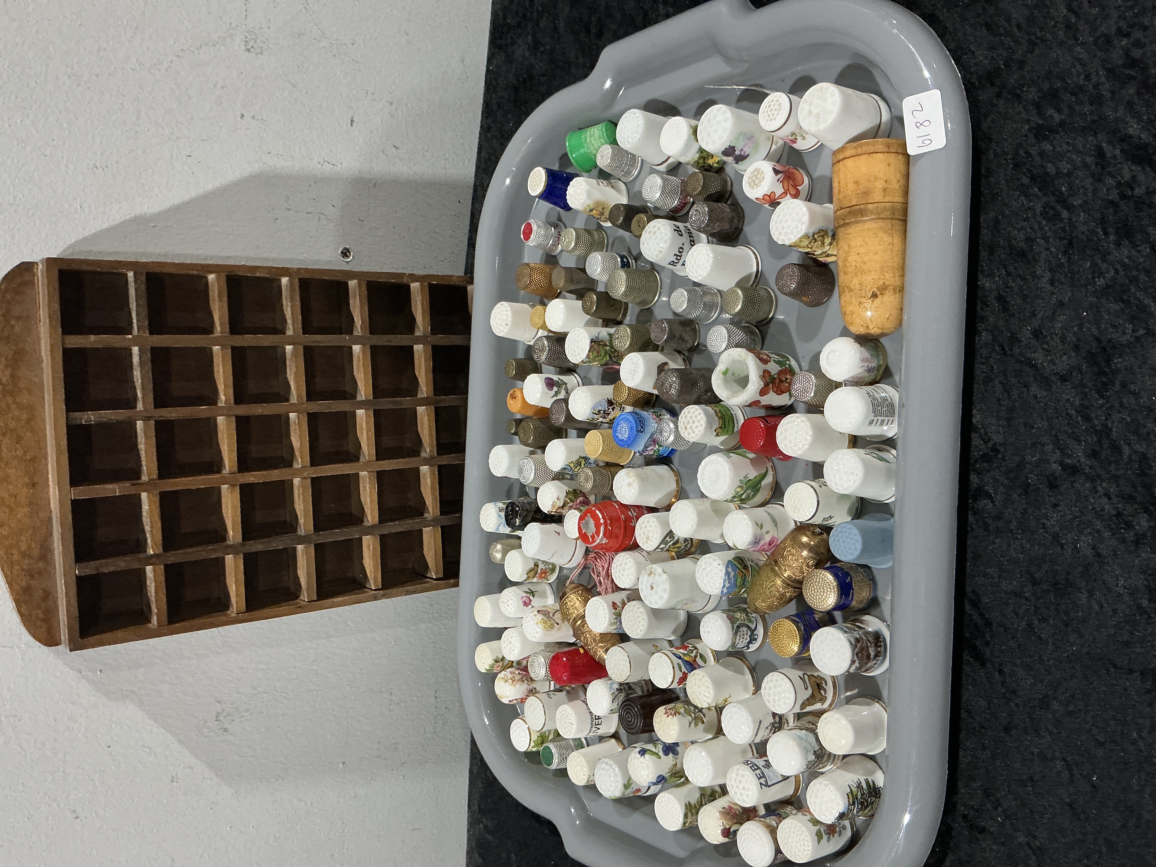 The lot comprises a collection of 75 assorted collectible thimbles and sewing implements, dating primarily to the 20th century. The majority of the collection consists of ceramic or porcelain souvenir thimbles, typically white with applied decals depicting floral patterns, scenery, tourist locations (including “Ibiza” and “Alnwick”), and commemorative text (including “PRINCE HARRY &…”). The collection also includes numerous metal thimbles in silver-tone, brass, and dark oxidized finishes, several solid-colored ceramic thimbles (red, blue, green, orange), and at least two items made of natural material, including one cylindrical wooden piece. The collection is presented in a glossy gray plastic tray, which bears the number “6182” marked on a small sticker. Also included is a tall, light brown wooden display cabinet designed for thimbles, structured with six rows of five compartments, totaling 30 open display cells.