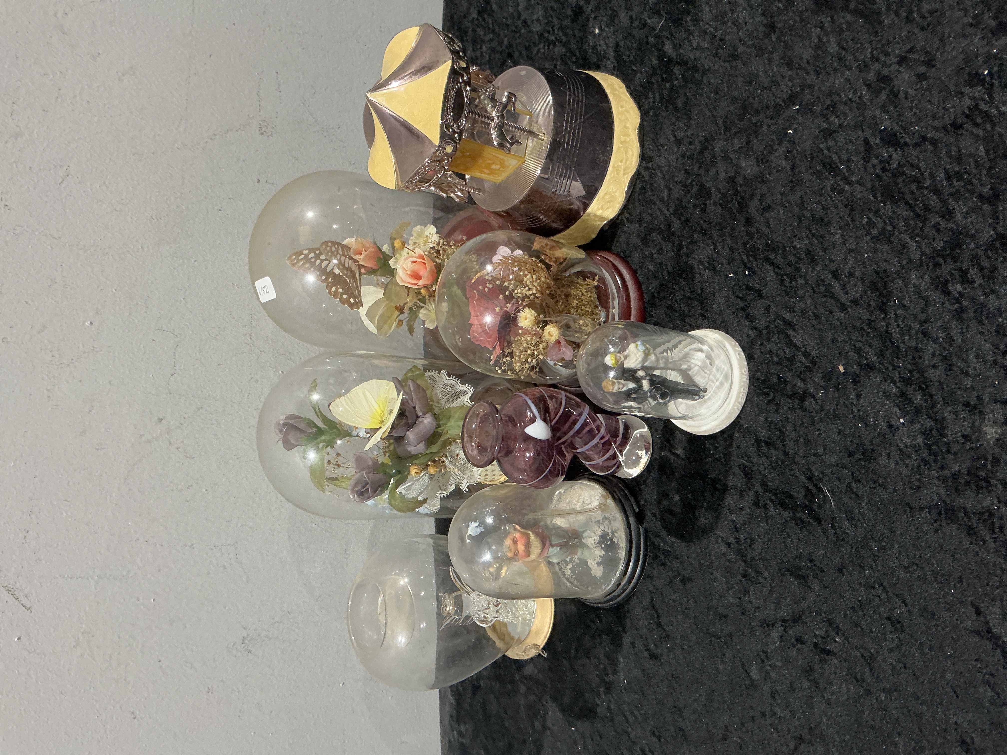 A collection of eight contemporary decorative items, primarily consisting of glass display domes (cloches) and novelty pieces constructed from glass, resin, fabric, and metal. The lot includes four glass domes of varying sizes. Two large domes contain arrangements of artificial roses, lace, and silk butterflies (one yellow, one brown speckled). A smaller dome houses a snow-globe style bearded figurine, and another small dome contains a wedding figurine marked WEDDING DAY on the base. Also present is a purple coiled art glass vase featuring white swirling accents, a clear globular glass vessel on a small wooden base, and a metallic novelty item, possibly a music box, designed as a carousel with a yellow and brown striped conical top.
