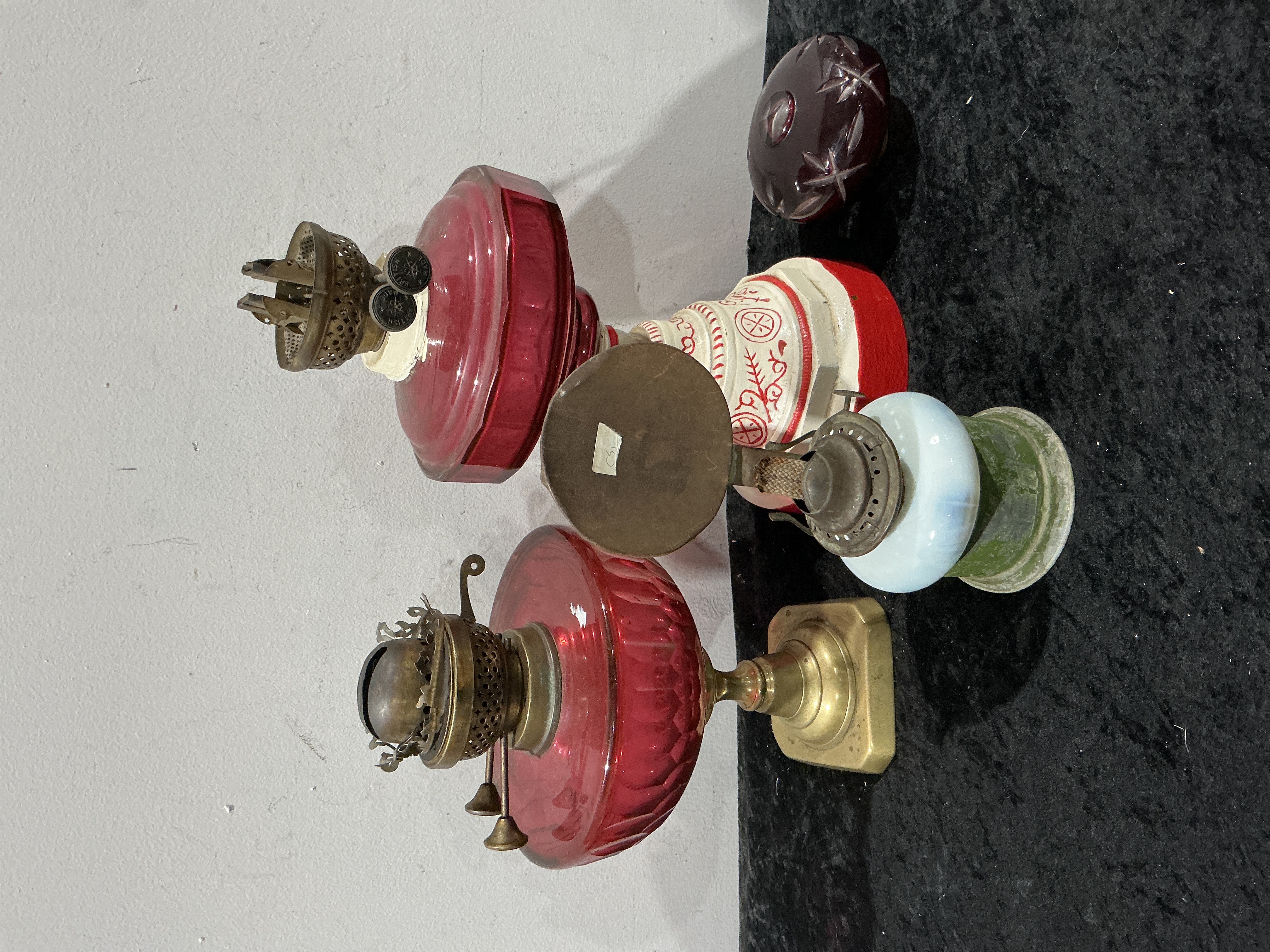 The collection comprises four items: three antique or vintage oil lamps and one separate cut glass accessory. The first lamp features a ribbed ruby red pressed glass font set upon a square, stepped brass pedestal base. The second lamp is taller, featuring a smooth ruby red glass font mounted on a white ceramic pedestal decorated with red geometric and folkloric patterns. The brass burner assembly on this lamp is marked BRITISH MADE on the wick raiser knobs. The third lamp is a small, squat finger lamp style with a variegated glass font exhibiting green and pale blue hues. It retains a heavily patinated tin burner assembly with an attached reflector shield, which bears a white CS1 inventory sticker. The fourth item is a small, oval piece of dark ruby or cranberry cut glass, faceted with starburst patterns, likely intended as a stopper or decorative weight.