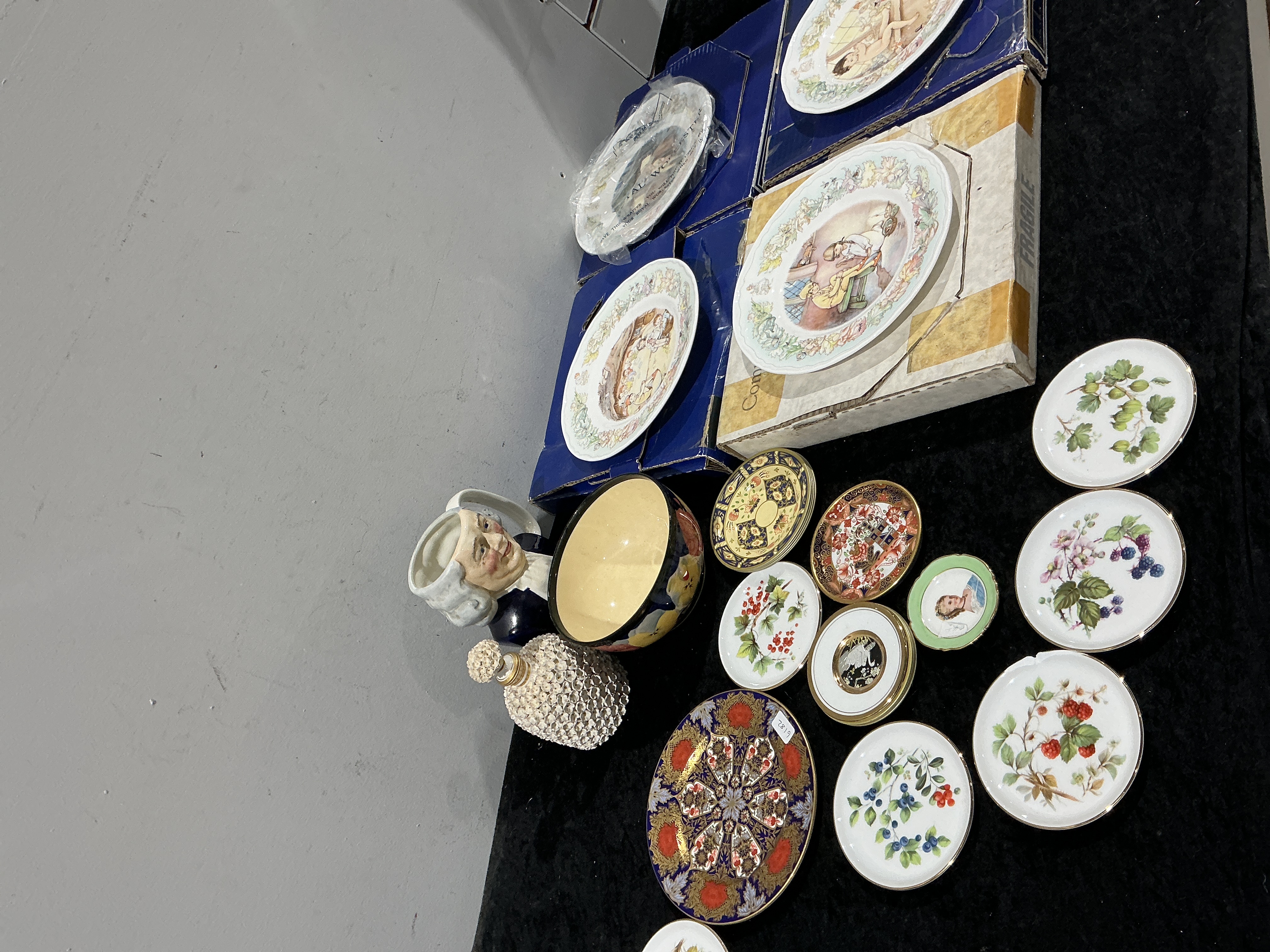 A collection of 21 assorted decorative ceramic and glass items. The lot includes seven porcelain dessert or collector plates attributed by consensus to Kahla, GDR (East Germany), dating to the 1950s, featuring detailed botanical fruit clusters and finished with gilt edging. These fruit plates depict various subjects including raspberries, blueberries, gooseberries, and blackberries. The lot also contains four large collector plates, two of which are partially contained within original blue boxes, displaying illustrative scenes. One large circular plate is present, featuring ornate patterned decoration in deep blue, red, and gold enameling, marked with the number 6182. Six miniature decorative dishes or trinket dishes are included, featuring portraiture, stylized heraldic patterns, and bird motifs, some arranged in small stacks. The collection is completed by three vessels: a large ceramic punch bowl with a yellow glazed interior and exterior floral motifs; a ceramic character jug molded in the form of a man in a powdered wig; and one white, textured ceramic or glass decanter with a stopper.